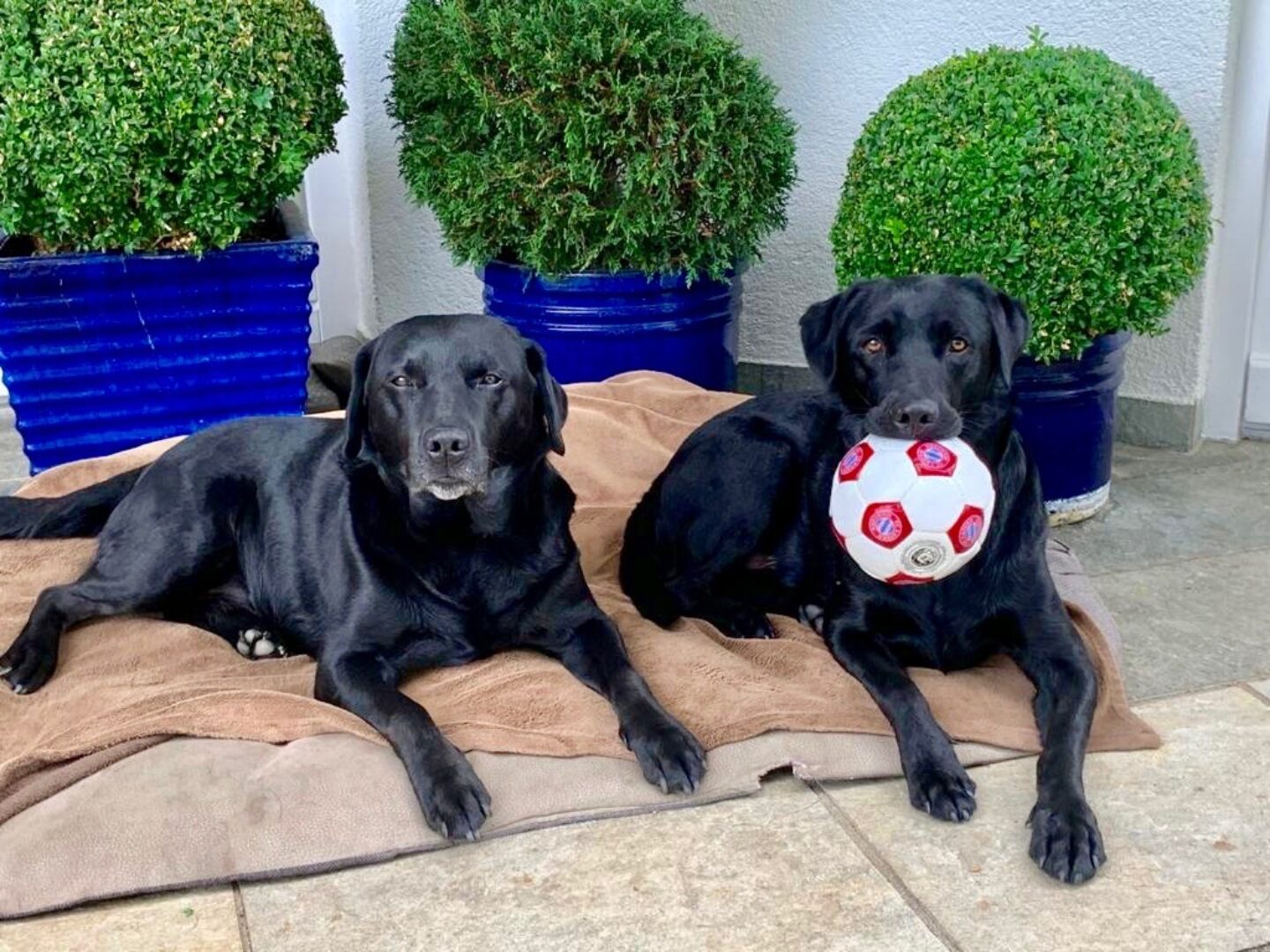 Unsere beiden Hunde Nero (8 Jahre) und Eddy (2 Jahre) sind, obwohl sie in Nürnberg zu Hause sind, waschechte Bayernfans, die aus Freude zum diesjährigen Meistertitel einen Fußball in seine Einzelteile zerlegt haben. Die beiden reinrassigen Labradore sind beides waschechte Bayern.