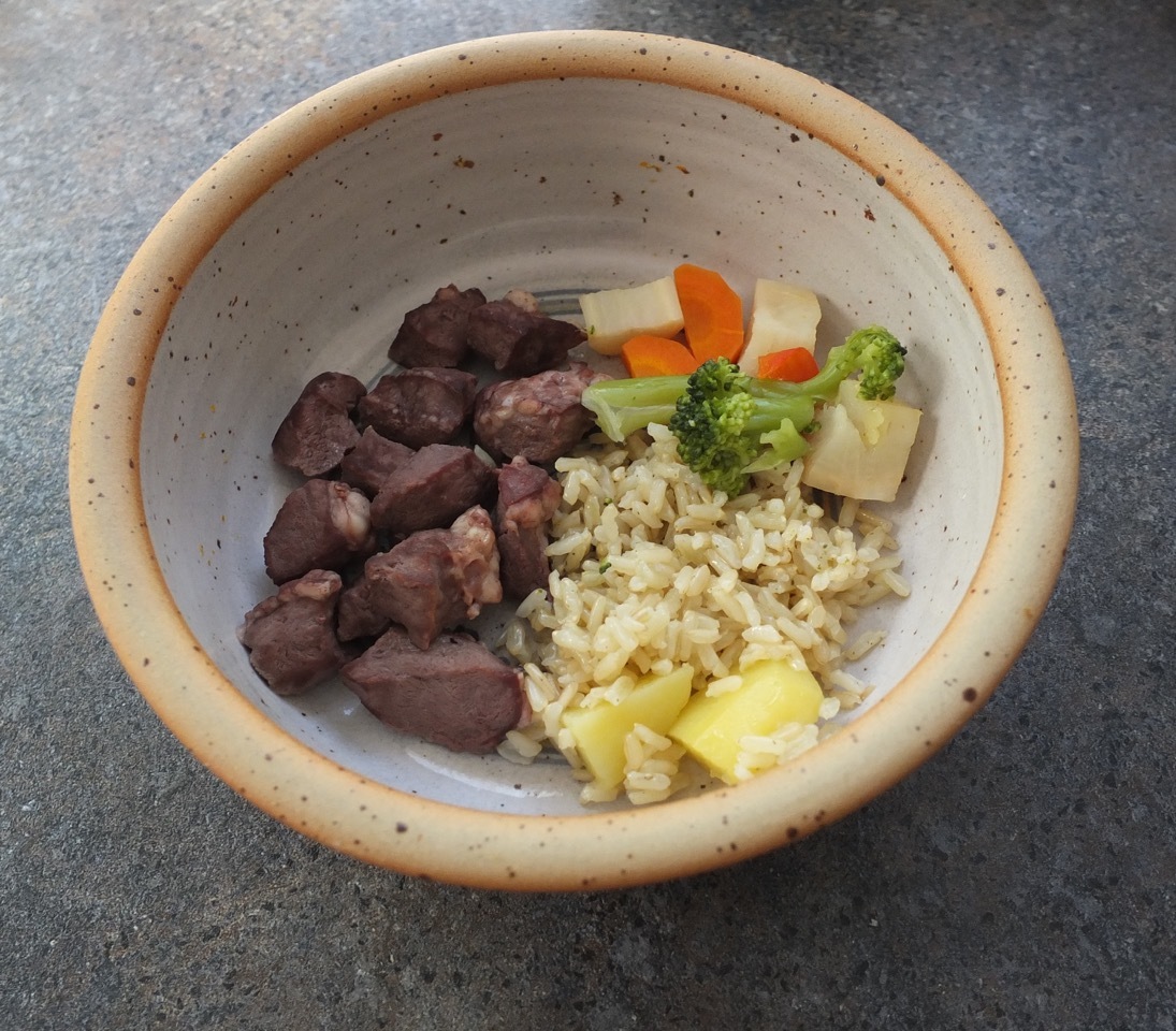 4. Ausgewogen und bekömmlich: Vielfalt an Nahrungsmitteln bietet auch Vielfalt an Nährstoffen! Wie man die Rationen zusammenstellt, kann dabei unterschiedlich aussehen. Will man es einfach oder auch als Einstieg kann man Bio-Fertigfutter mit frischen Nahrungsmitteln kombinieren. Man kann die Essensreste der eigenen, möglichst „cleanen“ Mahlzeiten integrieren oder alles extra für den Hund zubereiten. Natürlich sollte man darauf achten, dass die Mahlzeiten alles enthalten, was der Hund benötigt (siehe praktische Fütterung).
