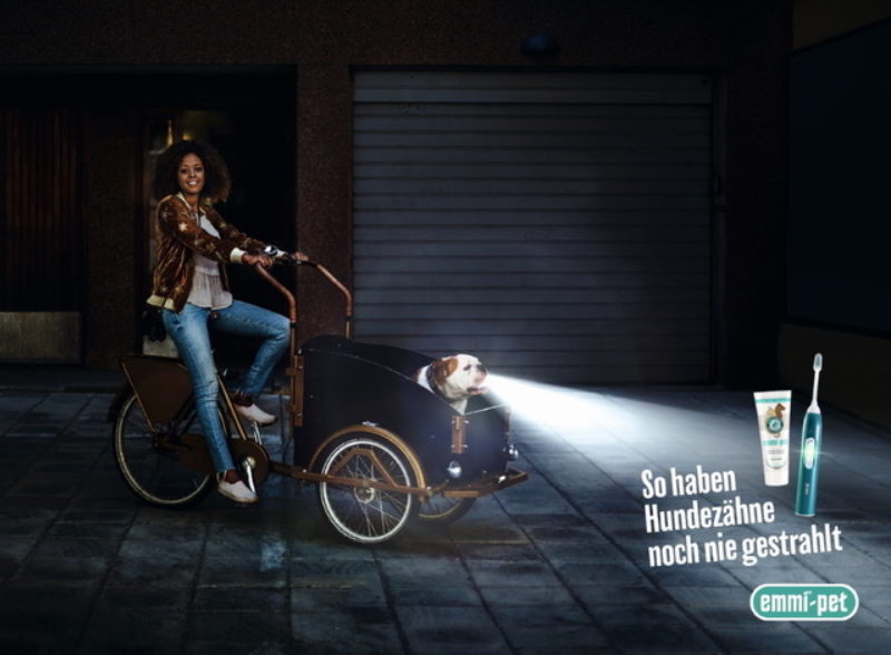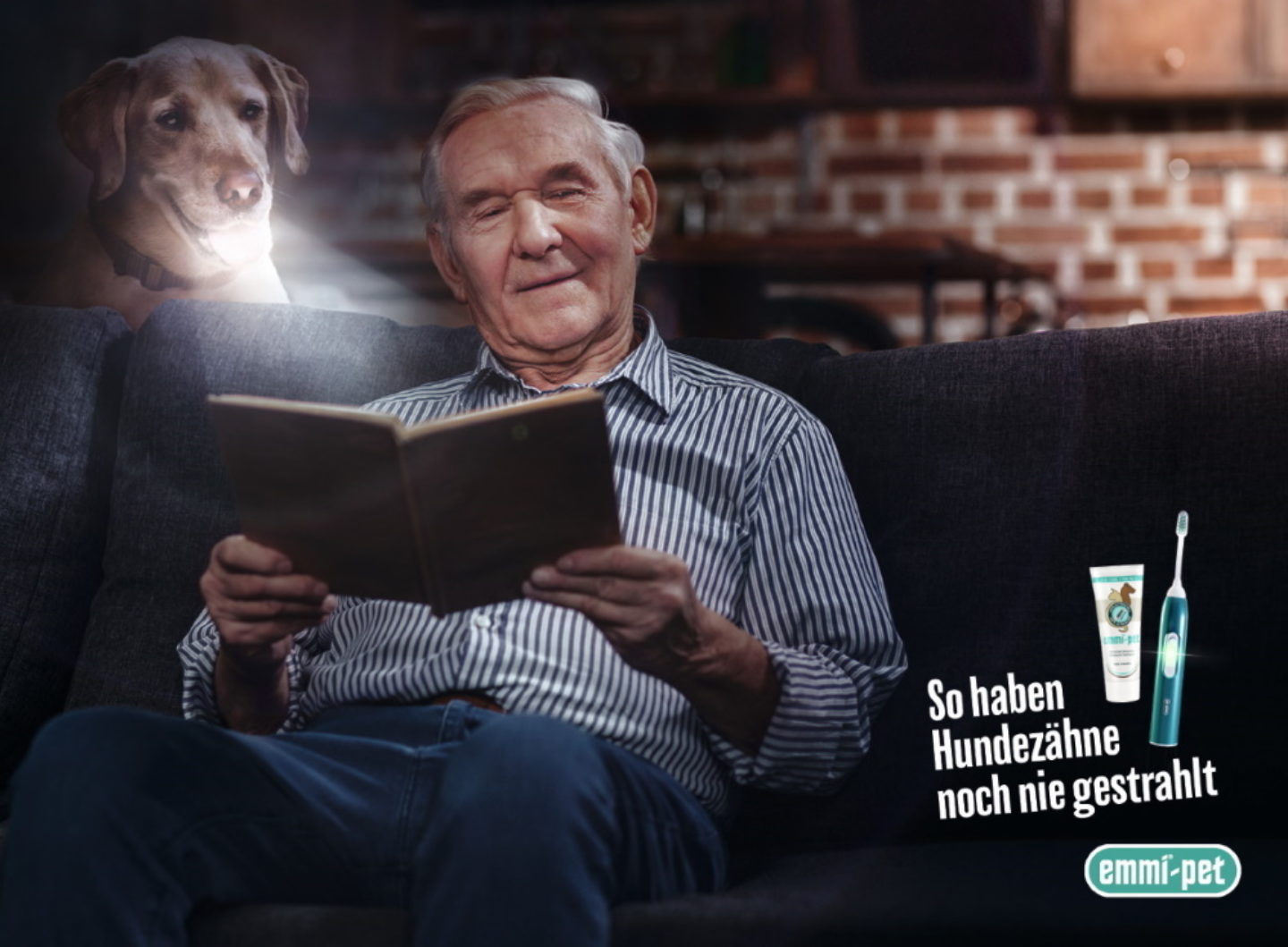 Die Anzeigenstrecke zeigt, wie Hunde und ihre Besitzer in kompletter Harmonie und als perfekt abgestimmtes Team zusammenleben. Dank der geräuschlosen und vibrationsfreien Zahnreinigung mit Ultraschallbürsten von emmi-pet können die strahlend weißen Hundezähne der Vierbeiner ihren Besitzern den Weg leuchten. „Wir haben den Taschenlampen-Effekt erfunden und dramatisieren so die erstaunliche Performance von emmi-pet“, erklärt Kreativ-Geschäftsführer Gunther Brodhecker die Idee hinter der Kampagne. Der besondere Look der Motivreihe wurde von Fotoartistin Meike Wittenstein erschaffen.