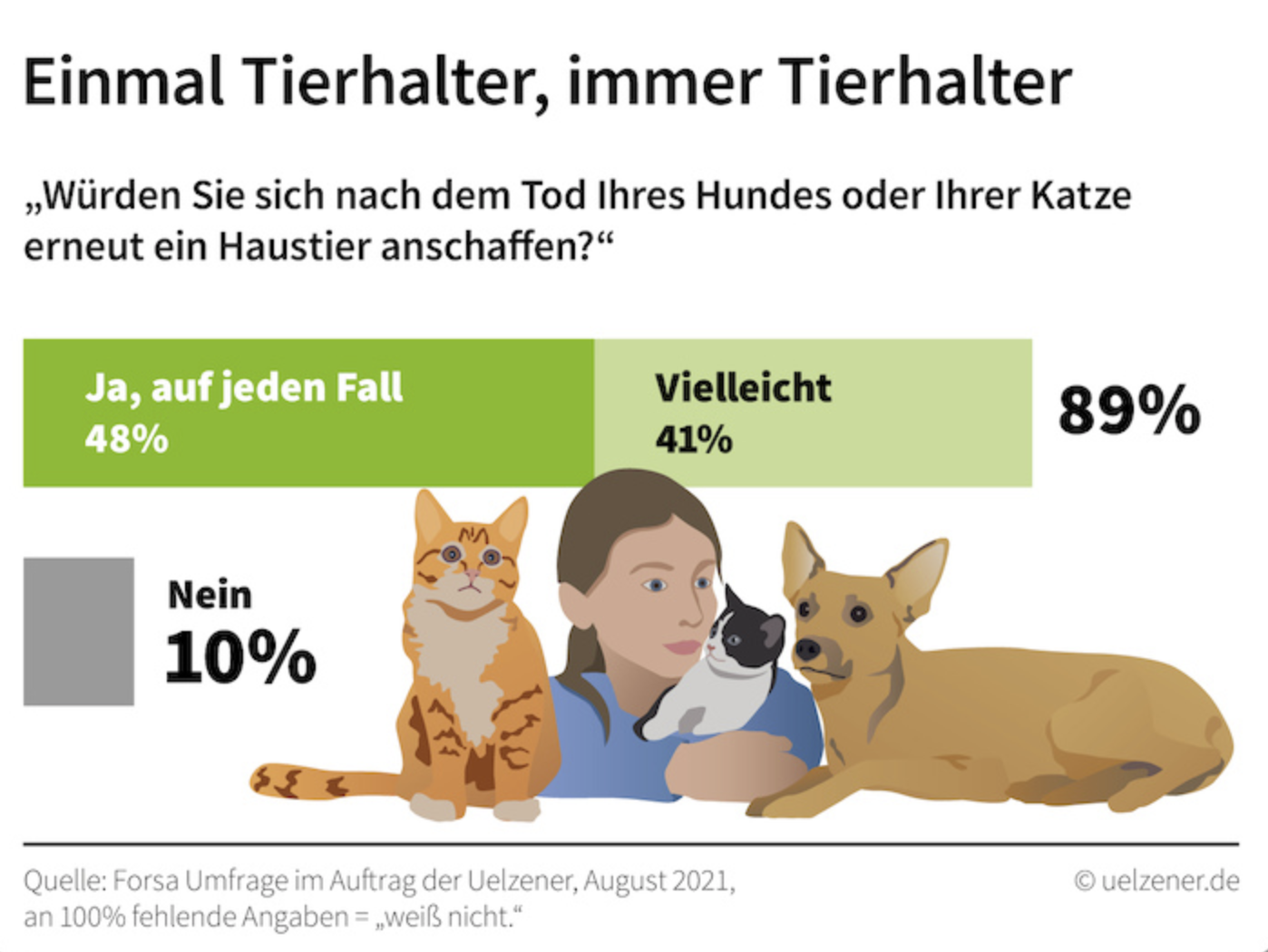 Eine Forsa-Umfrage unter Hunde- und Katzenhalter:innen im Auftrag der Uelzener Versicherung, dem Spezialversicherer für Tiere, hat ergeben: Fast 90 Prozent der Befragten ziehen es in Betracht, nach dem Tod des geliebten Tieres einen neuen Vierbeiner bei sich aufzunehmen. Rund die Hälfte der Befragten ist bei diesem Thema sehr entschlossen und würde sich auf jeden Fall für einen neuen Hund oder eine neue Katze entscheiden.