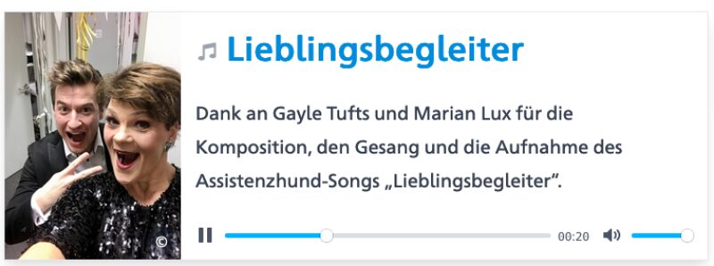 Die Entertainerin Gayle Tufts hat als langjährige Schirmherrin ein Liebeslied an den Assistenzhund komponiert, das auf der Website des Vereines zu hören ist."