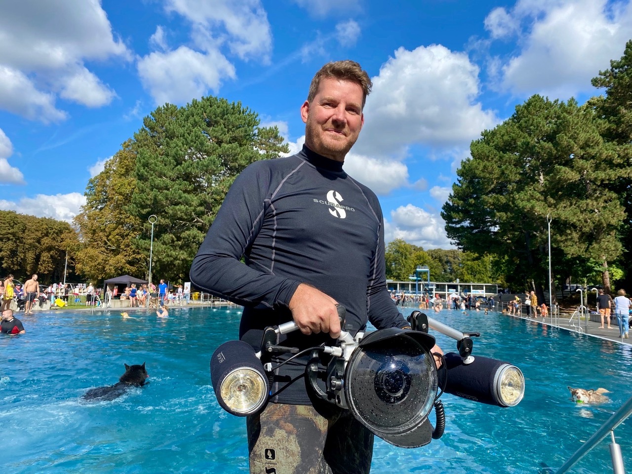 Während Meike Schmitz über Wasser arbeitet, steigt der in der Kölner Südstadt lebende Fotograf Marc Hillesheim ins Wasser, um dort seine schwimmenden Modelle in Szene setzt. Gut zehn Kilogramm wiegt seine Unterwasser-Kamera, mit der er an diesem Sonntag sehr besondere Bilder macht. "Für mich ist das heute ein unheimlicher Spaß", sagt Hillesheim, der in den letzten Wochen in ganz Deutschland unterwegs war, um für Tauchausrüster "Scubapro" Filme der besten Tauchspots der Republik produziert. Wer mag, schaut sich den Tauchgang in Rheinau an. Und wer wissen möchte, wie die Unterwasserfotos der Hunde aussehen, klickt in den Hunderunden-Artikel "Tauchende Hunde".