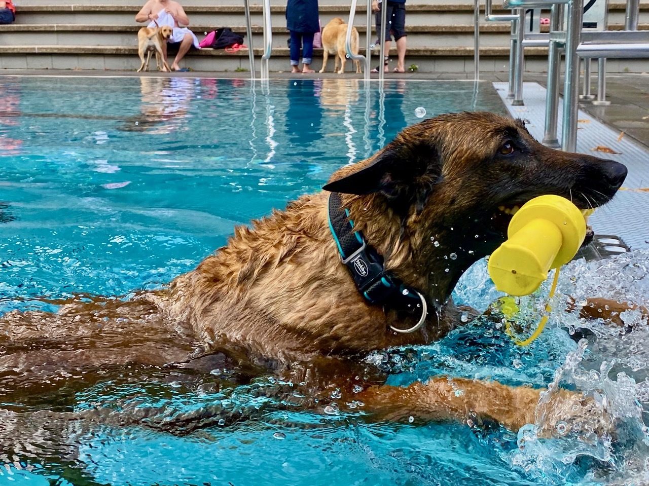 Viele Hundebesitzer:innen gehen an diesem Tag mit ihren Vierbeinern ins Wasser. So auch Toni, der seine 12-jährige Labrador-Hündin Nelly immer wieder ins Wasser lockt. In regelmäßigen Abständen schmeißt er Nellys Lieblingsspielzeug ins Becken. Nelly, mittlerweile in die Jahre gekommen, trägt seit zwei Jahren eine Weste, die dem Hund einerseits Auftrieb im Wasser verleiht. "Zusätzlich haben wir die Möglichkeit, mit dem angebrachten Assistenzgriff ihr besser aus dem Becken zu helfen", erklärt Besitzerin Helga, die hinzufügt, dass sie regelmäßig gemeinsam mit ihrer Hündin Stand-Up-Paddling machen. Zum siebenten Mal bereits sind die Wasserratten aus Frechen beim Hundeschwimmtag und versprechen, auch in der kommenden Saison dabei zu sein.