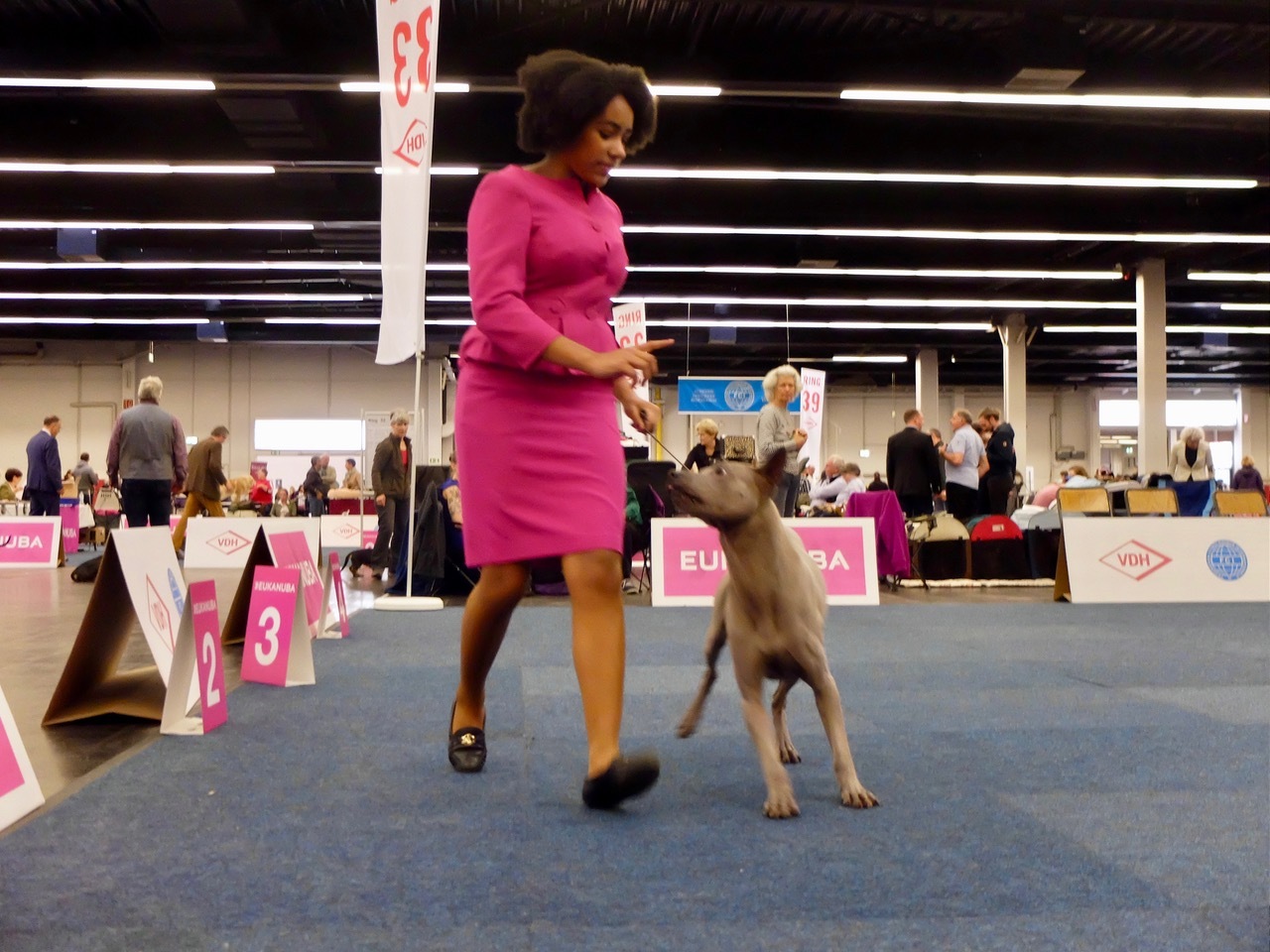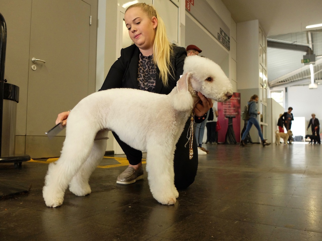 Ganz aufgeregt sind Kim aus dem baden-würtembergischen Nagold und ihr Bedlington Terrier "Karma", die zum ersten Mal in den Ring gehen, um sich den Juroren zu stellen. Der 14 Monate junge Karma hat eine gute Ausbildung genossen und sich zu einem treuen und gehorsamen Begleiter entwickelt, so dass die Besitzerin guter Dinge ist, im Ring mit Karma bestehen zu können. "Manchmal jedoch kommen die Terriergene hervor, und der Jäger kommt zum Vorschein", erklärt Kim, die unter ein wenig Lampenfieber leidet.