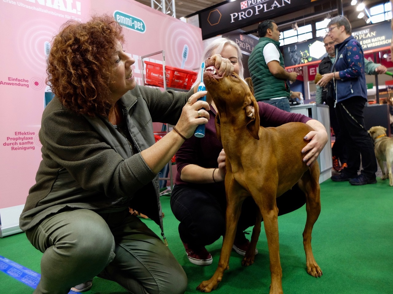 Der Magyar Vizsla, so liest man überall, ist ein kluger Hund, der schnell neue Dinge lernen kann. "Guinnie", die zweijährige Hündin von Sabine und Angelika, lässt sich normalerweise gerne die Zähne putzen. Sie hat es sich quasi von ihren Geschwistern zu Hause abgeschaut. Die "Live-Demonstration" auf der Messe ist jedoch ein wenig zu hektisch, erst nach einigen Anlaufschwierigkeiten funktioniert die Zahnreinigung. "Seit einem Dreivierteljahr putzen wir unseren Hunden täglich die Zähne mit Ultraschall-Zahnbürste von Emmi-Pet. Der Hersteller verspricht, dass Plaque und Bakterien auch aus den engsten Zahnzwischenräumen ganz sanft ohne Schrubben und Brummen entfernt, sowie Entzündungen und Folgekrankheiten reduziert werden. Sabine und Angelika jedenfalls sind sehr zufrieden und würden jedem Hundehalter empfehlen, frühzeitig mit der Zahnpflege ihrer Vierbeiner zu beginnen.