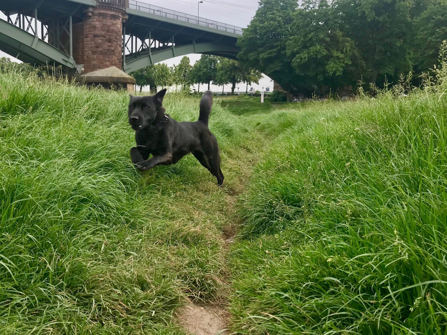 Das Foto wurde im Mai 2019 im Kölner Süden unter der Südbrücke aufgenommen. Pepples Lieblingsrunde führt am Rhein an den Pollerwiesen entlang. Hier können Hunde ganz wunderbar laufen, sich im Rhein abkühlen, bzw. einen Schluck gegen den Durst nehmen und den Kölner Dom auf der anderen Rheinseite beobachten.