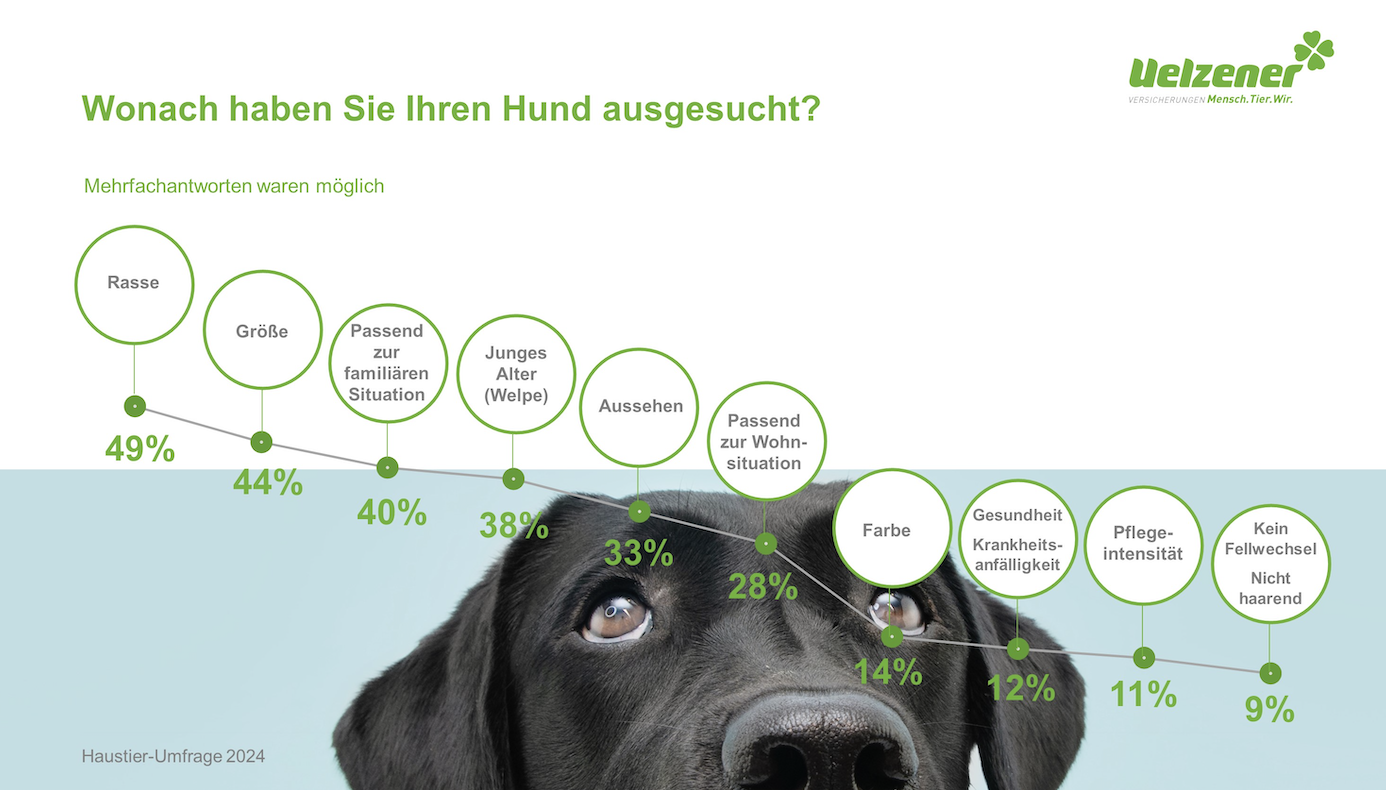 Neben der Ausbildung wurden in der Uelzener-Studie auch die Kriterien abgefragt, nach denen Hundehalter:innen ihre Vierbeiner auswählen. An erster Stelle steht die Rasse (49 %), gefolgt von Größe (44 %) und der Eignung für die Familiensituation (40 %). Überraschenderweise spielen Faktoren wie Farbe (14 %), Pflegeintensität (11 %) oder Fellwechsel (9 %) eine vergleichsweise untergeordnete Rolle.