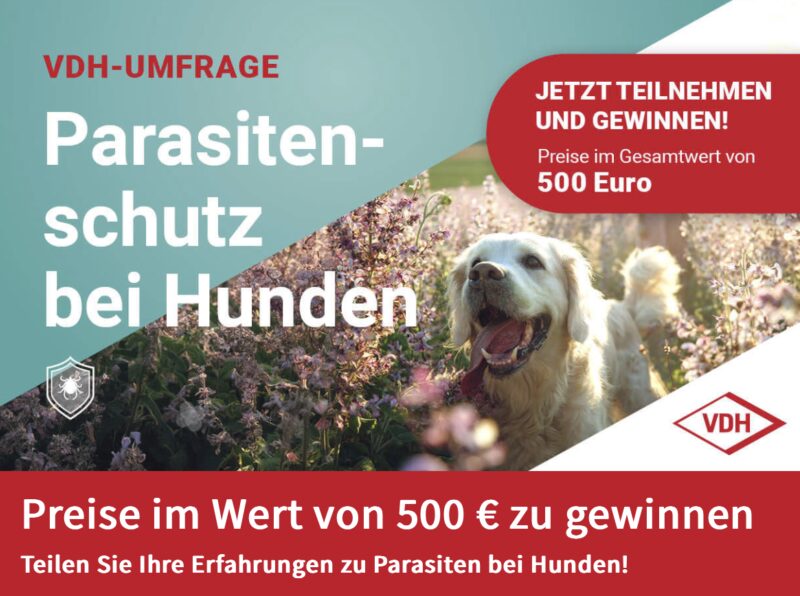 Deshalb führt der VDH die digitale Umfrage "Teile Deine Erfahrungen: Parasiten bei Hunden 2024" durch. Hundehalter:innen sind herzlich eingeladen, teilzunehmen und ihre Erfahrungen mitzuteilen. Die Teilnahme ist bis zum 30. September 2024 möglich und dauert nur wenige Minuten. Wer will, gibt seine Email-Adresse an und hat die Möglichkeit, Preise im Wert von € 500.- zu gewinnen, u.a. ein hochwertiger, personalisierter Beton-Futternapf von Betolz.