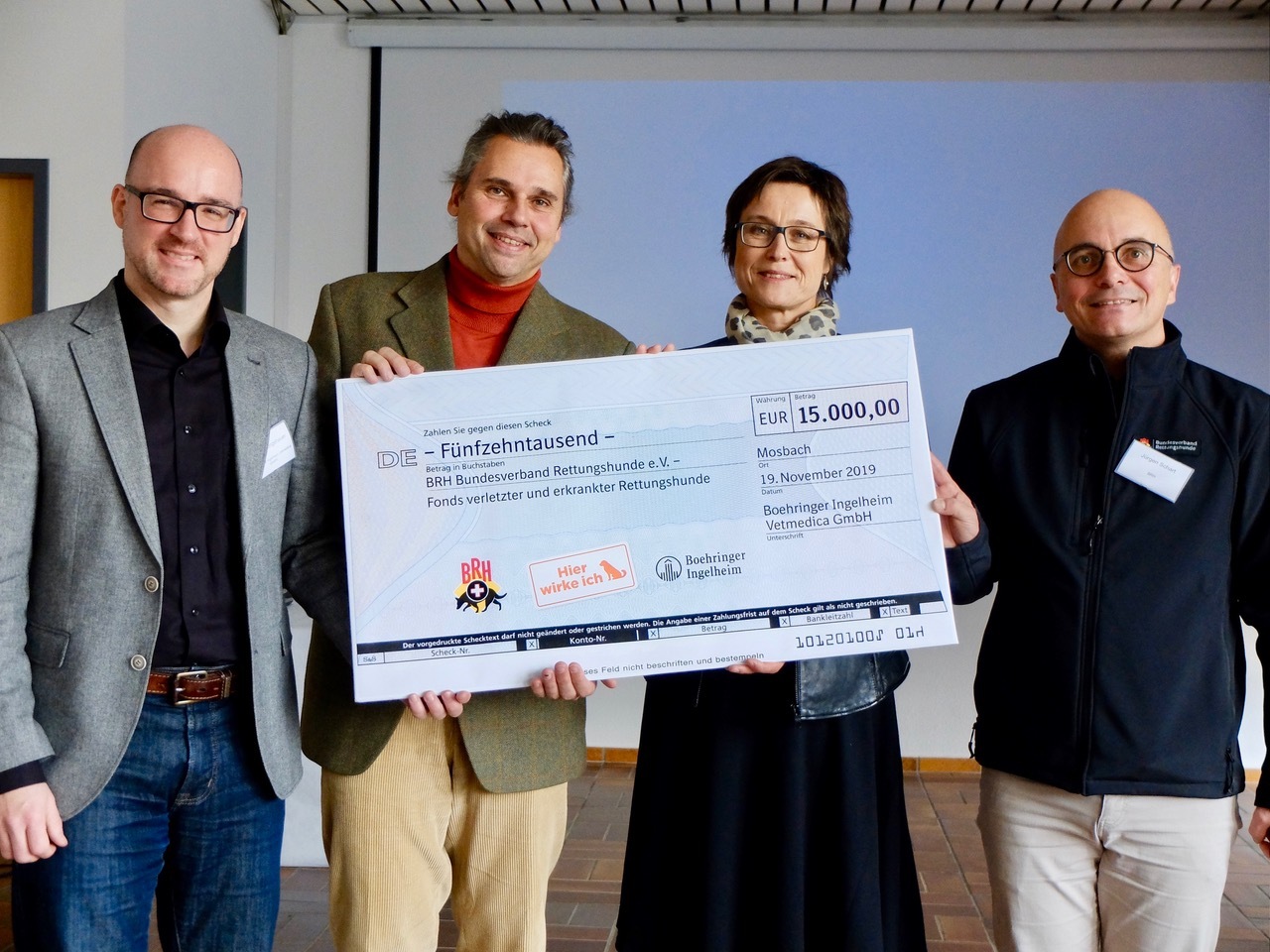 Diese Einsätze sind für die Angehörigen oder die anfordernden Behörden in der Regel kostenfrei. Das bedeutet, dass der Verband auf Mitglieds- und Spendengelder angewiesen ist. Boehringer Ingelheim Vetmedica hat sich entschlossen, die Arbeit des BRH jetzt mit der Aktion „Hier wirke ich“ (www.hier-wirke-ich.de) zu unterstützen, um einen finanziellen Beitrag für die schnelle Genesung der Rettungshunde zu leisten. Dr. Ulrike Langbein, Dietmar Ungeheuer und Dr. Karsten Hesse übergaben Jürgen Schart am 22. November 2019 auf dem BRH-Trainingsgelände in Mosbach einen Scheck in Höhe von 15.000 Euro.