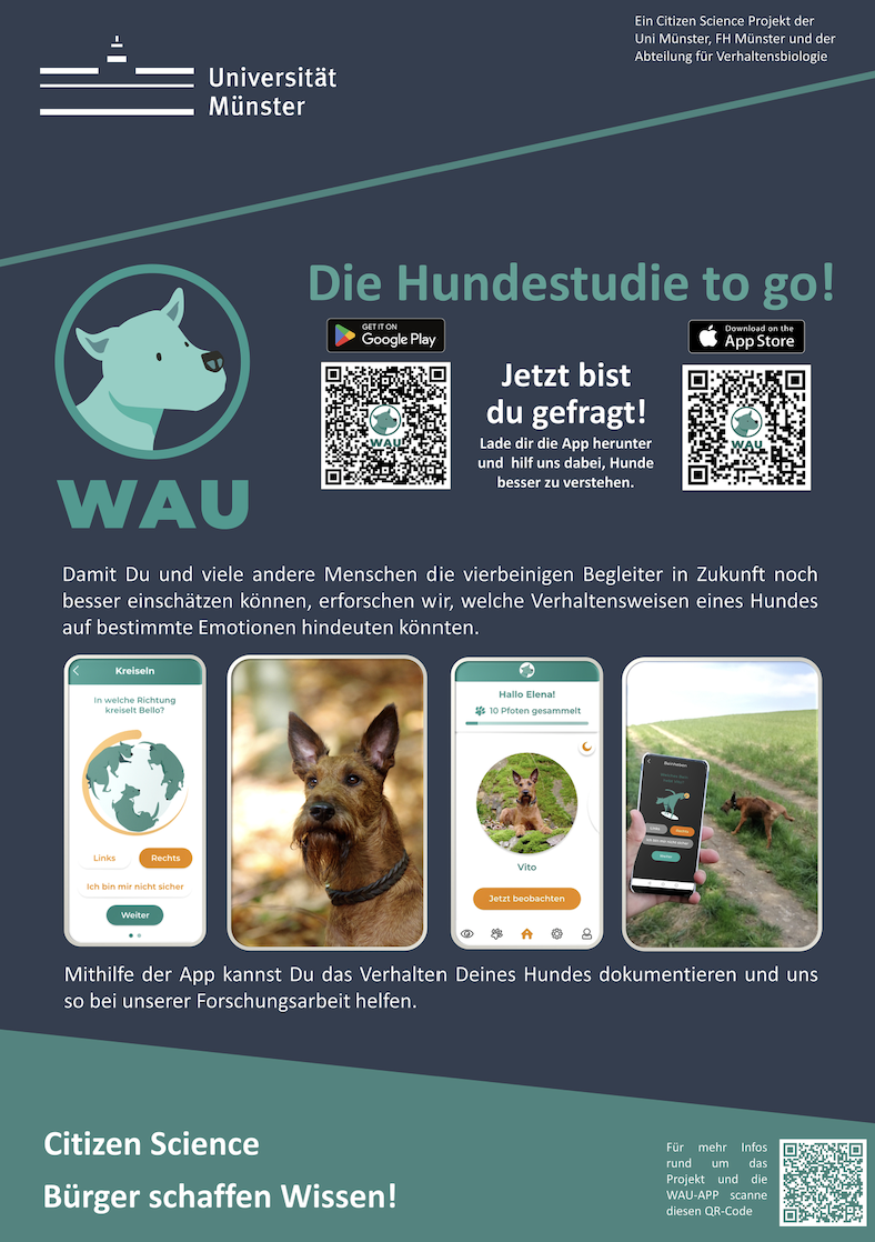 Hundehalter:innen, die ein Forschungsprojekt des Instituts für Verhaltensbiologie der Universität Münster zum Tierwohl unterstützen möchten, können dies per Smartphone erledigen – mit der „WAU-App“. Über diese kostenlose App können Interessierte die Emotionen und das Verhalten ihrer Hunde erfassen. Es ist kein spezielles Vorwissen nötig. Die WAU-App lässt sich im Google Play Store oder im Apple App Store herunterladen.