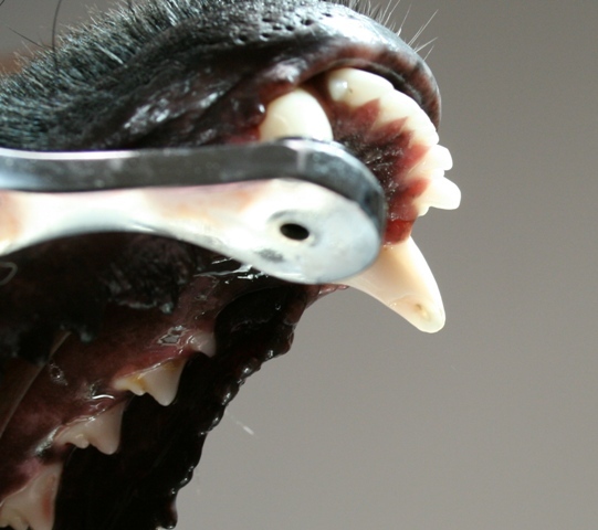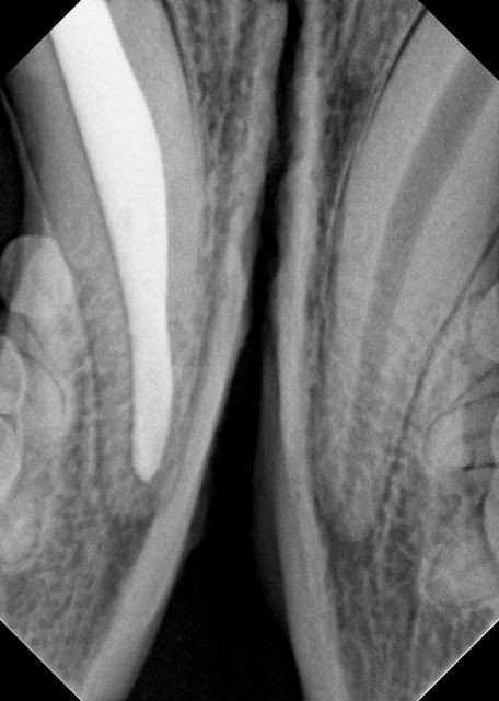 Grundsätzlich gibt es bei Zahnfrakturen mit Entzündung des Pulpa nur zwei Möglichkeiten: Entweder man unterzieht den Zahn einer Wurzelkanalbehandlung oder man „zieht“ den Zahn. Die letzte Option kam für „Piko“ nicht in Betracht, würde doch das Fehlen eines Eckzahns seine Dienstfähigkeit ausschließen. Auch für die ordnungsgemäße Zungenführung sind die Unterkiefereckzähne wichtig. Fehlt ein Unterkiefereckzahn, hängt die Zunge meist auf der Seite des Fangs heraus. Dies führt nicht selten zu sehr schmerzhaften Zungenverletzungen. Auch führt die Extraktion eines Unterkiefereckzahnes zu einer deutlichen Schwächung des Unterkiefers, denn die Wurzel des Unterkiefereckzahnes ist etwa anderthalb mal so groß wie die sichtbare Zahnkrone. Es kann zur Fraktur des Unterkiefers kommen. Also viele Argumente, die für einen Zahnerhalt durch Wurzelkanalbehandlung sprechen.