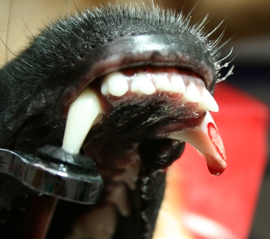 Bei der klinischen Allgemeinuntersuchung zeigten sich keine Auffälligkeiten, bei der Untersuchung der Maulhöhle und der Zähne konnte man am rechten Unterkiefereckzahn eine kleine Absplitterung erkennen. Dies könnte die Ursache für den „lockeren Biss“ sein. „Piko“ wurde in Allgemeinanästhesie versetzt um die Maulhöhle und Zähne eingehend untersuchen zu können. An der Bruchstelle des rechten Unterkiefer-Eckzahnes konnte ein kleiner rötlicher Punkt ausgemacht werden, der auf die unmittelbare Nähe der Frakturstelle zur Pulpenhöhle, dem Sitz des „Nervs“ schließen ließ. Nach der Röntgenuntersuchung des Zahnes wurde der Zahn trepaniert, um die Pulpa beurteilen zu können. Hierbei entwich unter Druck stehender Eiter und Blut, was schließlich erklärte, warum „Piko“ nicht mehr mit voller Kraft zubeißen konnte.