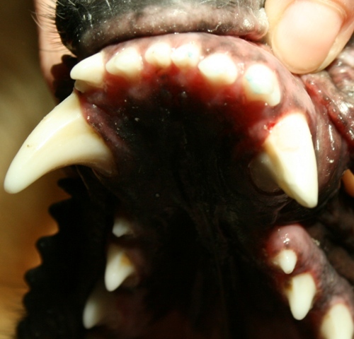 Obwohl es sich bei einer derartigen Entzündung um einen hochgradig schmerzhaften Prozess handelt, fraß „Piko“ ganz normal und zeigte auch keinen Schmerz oder sonstige Verhaltensauffälligkeiten. Warum? Hunde erleiden dieselben Zahnschmerzen wie wir Menschen - das konnte durch wissenschaftliche Untersuchungen zweifelsfrei festgestellt werden. Hunde bzw. Wölfe haben aber in der freien Wildbahn keine Möglichkeit, etwas an der Ursache zu ändern und einen Tierzahnarzt aufzusuchen. Wenn SICH ein Wolf im Rudel jedoch aufgrund von Zahnschmerzen beim Fressen nicht durchsetzen kann, wird er von seinen Kollegen „rausgebissen“ und muss sich „hinten anstellen“. Er bekommt das, was die anderen Wölfe übrig lassen. Der Anfang vom Hungertod. Und somit „beißen“ auch unsere Hunde beim Fressen die Zähne zusammen und vermeiden es, Zahnschmerzen zu zeigen.