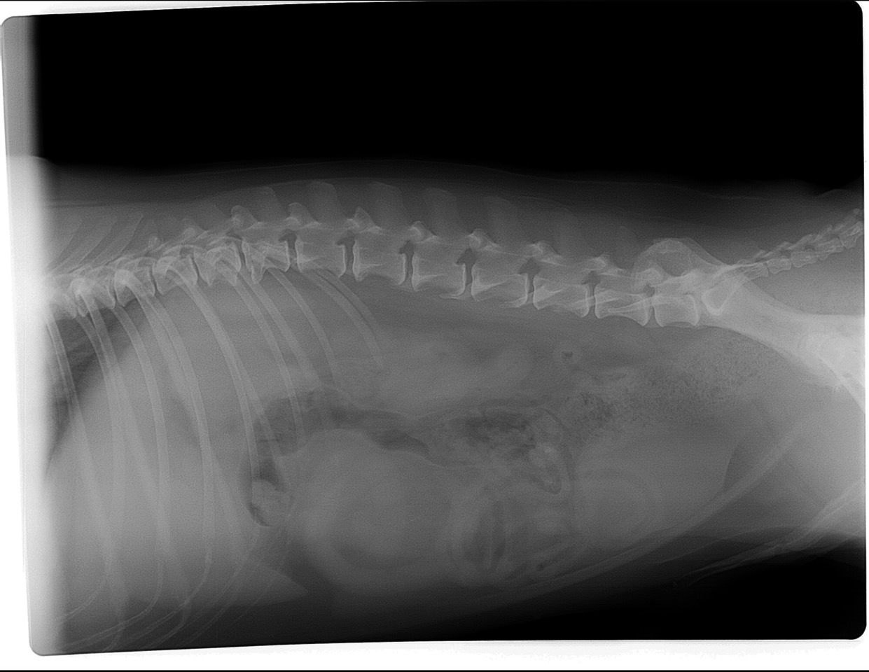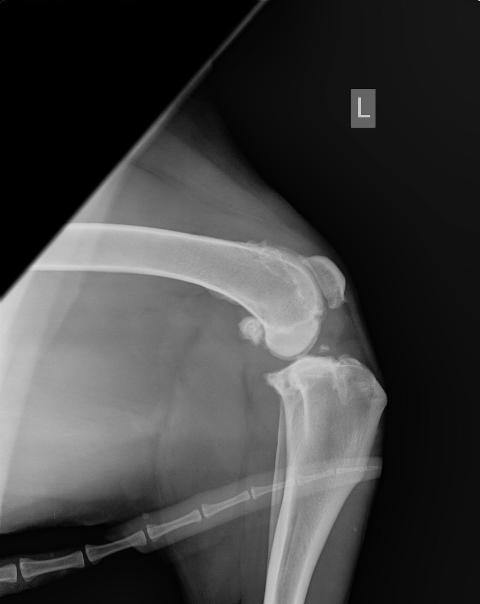 Die Röntgenaufnahmen des Haustierarztes vom linken Knie sowie des Knies und der Hüfte zeigen einen alten Kreuzbandriss (KBR) mit bereits hochgradiger Arthrose des Kniegelenks. Die Knie-Mechanik wird durch die Arthrose vermutlich mehr beeinträchtigt als durch den KBR. Weitere Röntgenbilder liegen nicht vor. Da Lea zudem sehr auffällig in der Wirbelsäule ist, haben wir auch hier Röntgenbilder angefertigt. Auf diesen sind ebenfalls hochgradige Arthrosen sowie ein Bandscheibenvorfall in der hinteren Brustwirbelsäule zu sehen. Das ist wohl momentan Leas hautsächliches Problem. Bei einer Kreuzbandriss-OP mit entsprechender Lagerung und anschließender Schonhaltung wäre die Wirbelsäulen-Problematik möglicherweise noch weiter verschlechtert worden. Das hätte im schlimmsten Fall sogar zu einer vollständigen Lähmung führen können. Zudem sind die mechanischen Beeinträchtigungen im Knie durch die hochgradige Arthrose mit einer Kreuzband-OP nicht aufzulösen. Bei einer Instabilität des Kniegelenks wäre selbstverständlich eine Operation des KBR notwendig. Sofern die Stabilität des Gelenks erhalten ist, können auch durch konservative Behandlungsmethoden oft sehr erfreuliche Ergebnisse erzielt werden. In Leas Fall wäre eine Entfernung der Verkalkungen innerhalb des Gelenks empfehlenswert, sobald sie für eine OP hinreichend stabil ist, da diese „Fremdkörper“ im Gelenk immer wieder Entzündungen auslösen können.