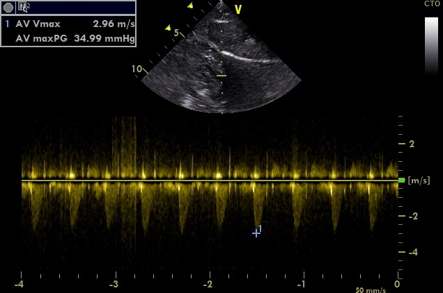 Bei der ersten Herzultraschalluntersuchung war Mailow fünf Monate alt. Dabei wurde im linksventrikulären Ausflusstrakt vor der Aortenklappe eine Einengung festgestellt. Es wurde eine geringgradige Subaortenstenose (SAS) diagnostiziert. Aortenstenosen verschlimmern sich häufig im Laufe des Wachstums, daher sollten auf jeden Fall auch bei anfänglich geringgradigen Befunden Folgekontrollen durchgeführt werden. Mailows Befund blieb relativ stabil. Bei seiner letzten Untersuchung war Mailow fast drei Jahre alt. Man maß in der Aorta eine maximale Blutflussgeschwindigkeit von 3 m/s (dies entspricht einem Druckgradienten von 36 mmHg). Bei gesunden Hunden ist die Blutflussgeschwindigkeit in der Aorta in der Regel unter 1,8 m/s (entspricht ca. 13 mmHg). Mit Hilfe der Flussgeschwindigkeit beziehungsweise des Druckgradienten kann man den Schweregrad der Aortenstenose einteilen.