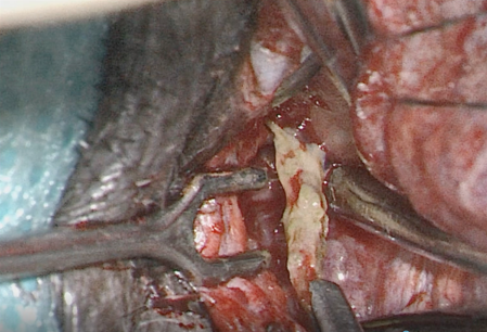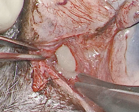 Im vorliegenden Fall wurde auf eine Kontrastdarstellung verzichtet. Zu groß wäre die Gefahr, einen Fremdkörper aus dem Tränensack in den noch weniger zugänglichen knöchernen Tränen-Nasen-Gang zu drängen. Stattdessen wurde eine chirurgische Therapie anvisiert. „Paul“ musste hierzu in Vollnarkose gelegt und so gelagert werden, dass man sich den Bereich unter dem OP-Mikroskop gut darstellen konnte.
