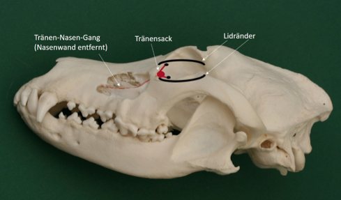 Die Tränenflüssigkeit ist ein sehr wertvolles Substrat, das in Form des Tränenfilms u.a. für die Ernährung, Feuchthaltung, Pflege und Transparenz der Hornhaut von enormer Bedeutung ist. Ihre Zusammensetzung ist komplex - sie wird aus den Tränendrüsen (beim Hund zwei; eine zusätzliche am dritten Augenlid = wässriger Anteil), den Becherzellen der Bindehaut (schleimiger Anteil) und den Meibom-Drüsen am Lidrand (fettiger Anteil) beständig nachgebildet.