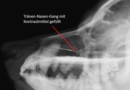 Mit einer dünnen Plastikkanüle kann man den Tränenkanal unter Lokalanästhesie normalerweise gut spülen. Die Tiere tolerieren das sehr gut. Bei „Paul“ war das anders: Es kam bei Spülung über den oberen Tränenpunkt nur Eiter aus dem unteren. Über die Nase floss gar nichts ab und „Paul“ war die Prozedur sichtbar unangenehm. So bestand nun der Verdacht auf einen Fremdkörper im sogenannten Tränensack. Eine „einfache“ Entzündung wurde als unwahrscheinlich angesehen.