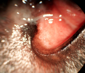 Während der Betrachtung der Tränenpünktchen (diese stellen die Öffnungen für die in den Tränengang ablaufende Tränenflüssigkeit dar) konnte man sehen, dass, vor allem bei Druck auf den nasalen Unterlidbereich, der Eiterfluss hier seine Quelle hatte. Das Sekret zeigte sich hier ursprünglich entsprechend „wurmförmig“.