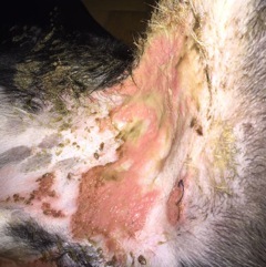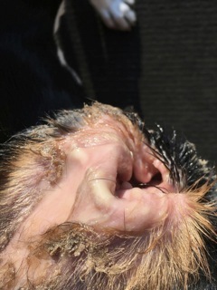 Es fing zunächst ganz harmlos an: Nemo schüttelte mit dem Kopf, zeigte also Symptome wie bei einer Ohrenentzündung. Doch trotz Therapie wurde das Schütteln intensiver, zusätzlich war er sehr unruhig, entwickelte Rötungen der Haut am Bauch und starken Juckreiz. Als er bei mir vorgestellt wurde, waren Blasen am Bauch sichtbar, die sich von den Achseln bis zur Leiste ausgedehnt hatten und sich großflächig ablösten und nässten. Die Innenflächen der Ohrmuscheln waren blutig-eitrig mit Krusten, und Nemo hatte starke Schmerzen, Fieber und kaum noch Appetit. Zusätzlich entwickelten sich Veränderungen an den Lefzen, an der Zunge und im Zwischenzehenbereich: Die oberflächlichen Hautschichten lösten sich ab. Es war ein offensichtlicher Notfall, wie er in der dermatologischen Praxis eher selten auftritt.