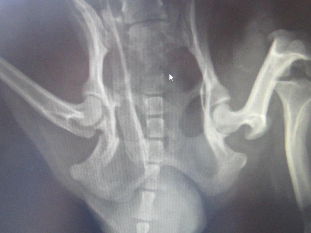 Auf der Abbildung (Bild 4 mit Pfeil) lässt sich eine Fraktur (Bruch) des Kreuzbeins mit einer geringgradigen Verschiebung darstellen. Diese verläuft in der Längsachse des Knochens und tangiert nur ganz gering den Rückenmarkskanal, in dem das Rückenmark und die Nerven verlaufen. Zusammen mit den Besitzern entschlossen wir uns, vorerst auf eine Operation zu verzichten und das Tier nur in einer Box ruhig zu halten, sowie die notwendigen Medikamente zu geben. Es sollte genauestens darauf geachtet werden, daß die normalen Körperfunktionen mit Urin- und Kotabsatz funktionierten und keine nervalen Ausfälle aufträten.
