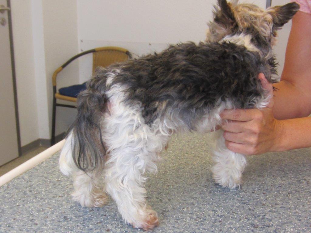Im Notdienst wurde uns ein Biewer Yorkshire Terrier mit 3,5 kg Körpergewicht vorgestellt, der wenige Stunden zuvor von einem Auto angefahren wurde. Der Rüde zeigte deutliche Schmerzen und konnte mit den Hinterbeinen nicht mehr auftreten, das rechte Hinterbein wurde komplett hochgezogen (Bild 1). Im Bereich des Beckens und der Oberschenkelmuskulatur waren ausgeprägte Blutergüsse sichtbar. Herz, Kreislauf und Atmung waren nicht beeinträchtigt, das Abtasten des Bauchraumes war nur im hinteren Bereich schmerzhaft. Der letzte Urinabsatz war nicht sicher bekannt.