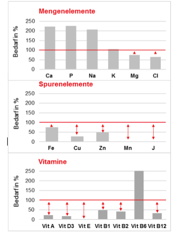 Meistens ist die zusätzliche Supplementierung eines vitaminisierten Mineralfutters die sicherste Variante eine ausgewogene Ration zu gewährleisten. Bei einem vitaminisierten Mineralfutter sollten die Inhaltsstoffe deklariert sein. In der Regel dienen sie zur Supplementierung der: