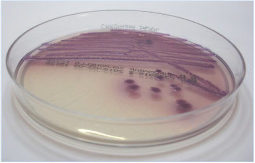 Beim Umgang mit rohem Fleisch ist eine strikte Hygiene einzuhalten, um das Infektionsrisiko für das Tier und den Tierhalter zu minimieren. Besonders in Haushalten mit gefährdeten Personen, wie Schwangeren, Kindern, alten oder immunsupprimierten Menschen, ist besondere Vorsicht geboten. Generell besteht eine Infektionsgefahr mit Bakterien, Parasiten und auch Viren. Durch rohes Fleisch besteht die Gefahr der Infektion mit enteropathogenen Keimen wie Salmonellen, Campylobacter, Yersinien und Listerien. Auch andere Keime wie Escherichia coli oder Toxin-bildende Bakterien wie Clostridium botulinum, Bacillus cereus oder Staphylococcus aureus können übertragen werden. Hunde und Katzen erkranken nicht unbedingt an den genannten Erregern, sondern können latent infiziert sein und diese über den Kot ausscheiden. Sie stellen somit eine Infektionsquelle für andere Tiere und auch für den Menschen dar (Abb. 5: Salmonellen in Reinkultur).