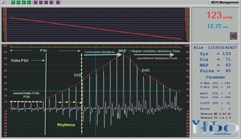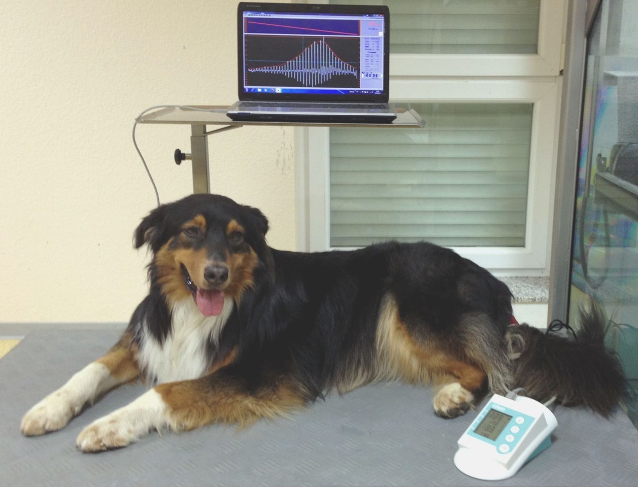 Wichtig ist, den Blutdruck mit einem für Tiere entwickelten Gerät zu messen (Abb. 2). Dabei sollte beachtet werden, dass die Messstelle entlastet und auf Herzhöhe liegt (genau wie beim Menschen). Die Manschette wird deshalb beim Hund gerne am Schwanz angelegt, denn dies ermöglicht eine Messung sowohl im Liegen und im Stehen. Der Hund kann sich also seine Lieblingsposition aussuchen. Die Messung selbst dauert auch nicht lange: in 15-20 Sekunden sind die Einzelergebnisse ermittelt und in nur zwei Minuten ist eine aussagekräftige Messreihe von 3-5 Einzelmessungen fertig. Jetzt kann entweder gehandelt oder Entwarnung gegeben werden.
