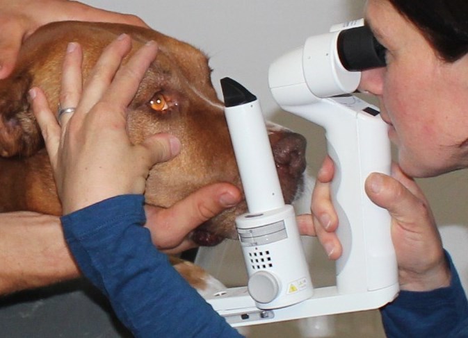 Wir untersuchen Charlys Auge nach allen möglichen Ursachen, die die Heilung verhindern können. Nach genauer Untersuchung unter 16-facher Vergrößerung und verschiedenen Tests können wir sicherstellen, dass bei Charly keiner dieser Gründe vorlag. Zudem sahen wir, dass das Fluorescein unter die Ränder des Ulcus kroch. Dies bedeutet, dass das Epithel an den Rändern des Ulcus nur lose aufliegt.