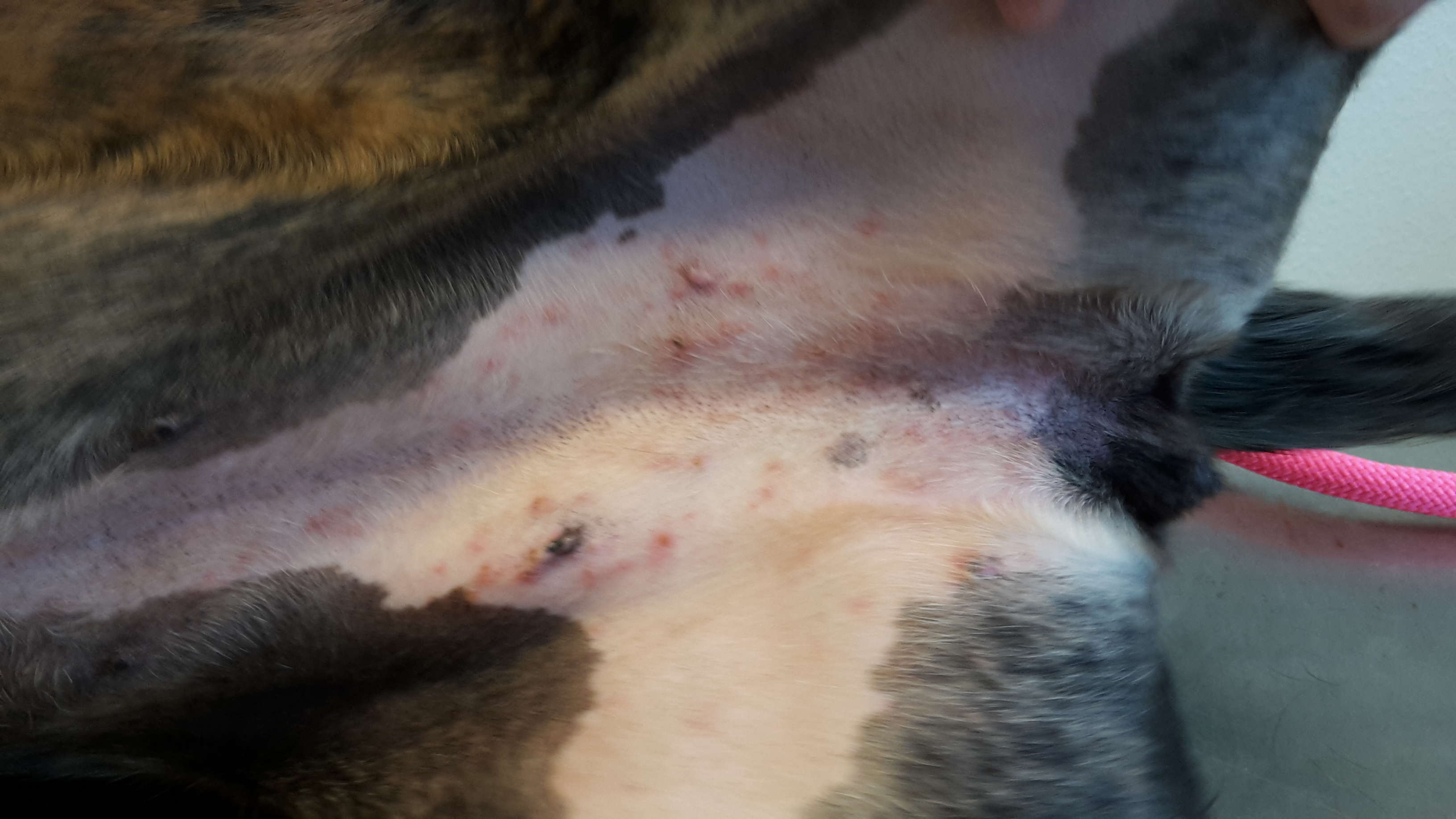Bei der Untersuchung zeigte „Ally“ eine reduzierte Muskulatur an Kopf und Gliedmaßen und Haarverlust an Nacken und Flanken. An allen Pfoten bestand eine deutliche Rötung der Haut im Zwischenzehenbereich. Die Gehörgänge waren sowohl im horizontalen, als auch im vertikalen Teil gerötet, geschwollen, und es bestand ein erhöhter Ohrenschmalzgehalt (erythematös-ceruminöse Otitis externa). Auch am ventralen Hals zeigte sich Haarverlust und Hautrötung, in den Achseln und Leisten Pusteln und Krusten. Entsprechend den gesammelten Daten aus Vorbericht (Anamnese) und klinischer Untersuchung wurden die möglichen Ursachen (Differenzialdiagnosen) für die Erkrankung formuliert: