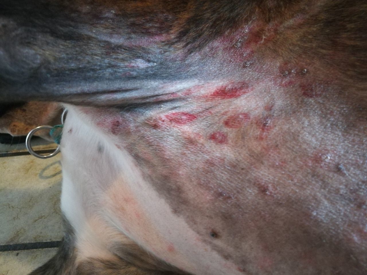 „Ally“ ist eine 3 Jahre alte Boxer-Hündin, die aufgrund starker Hautprobleme mit Juckreiz in der Hautsprechstunde vorgestellt wurde. Sie litt an wiederkehrenden Ohrenentzündungen (Otitis externa), leckte und kaute sich an allen Pfoten und rieb sich das Gesicht über den Teppich. Zudem zeigte sie immer wiederkehrende Entzündungen im Achsel- und Leistenbereich mit Rötungen der Haut (Erythem) und Anzeichen einer bakteriellen Infektion mit Pusteln und Krusten (Pyodermie).