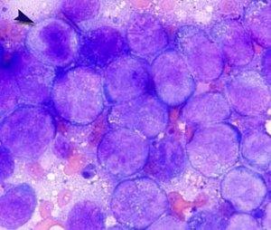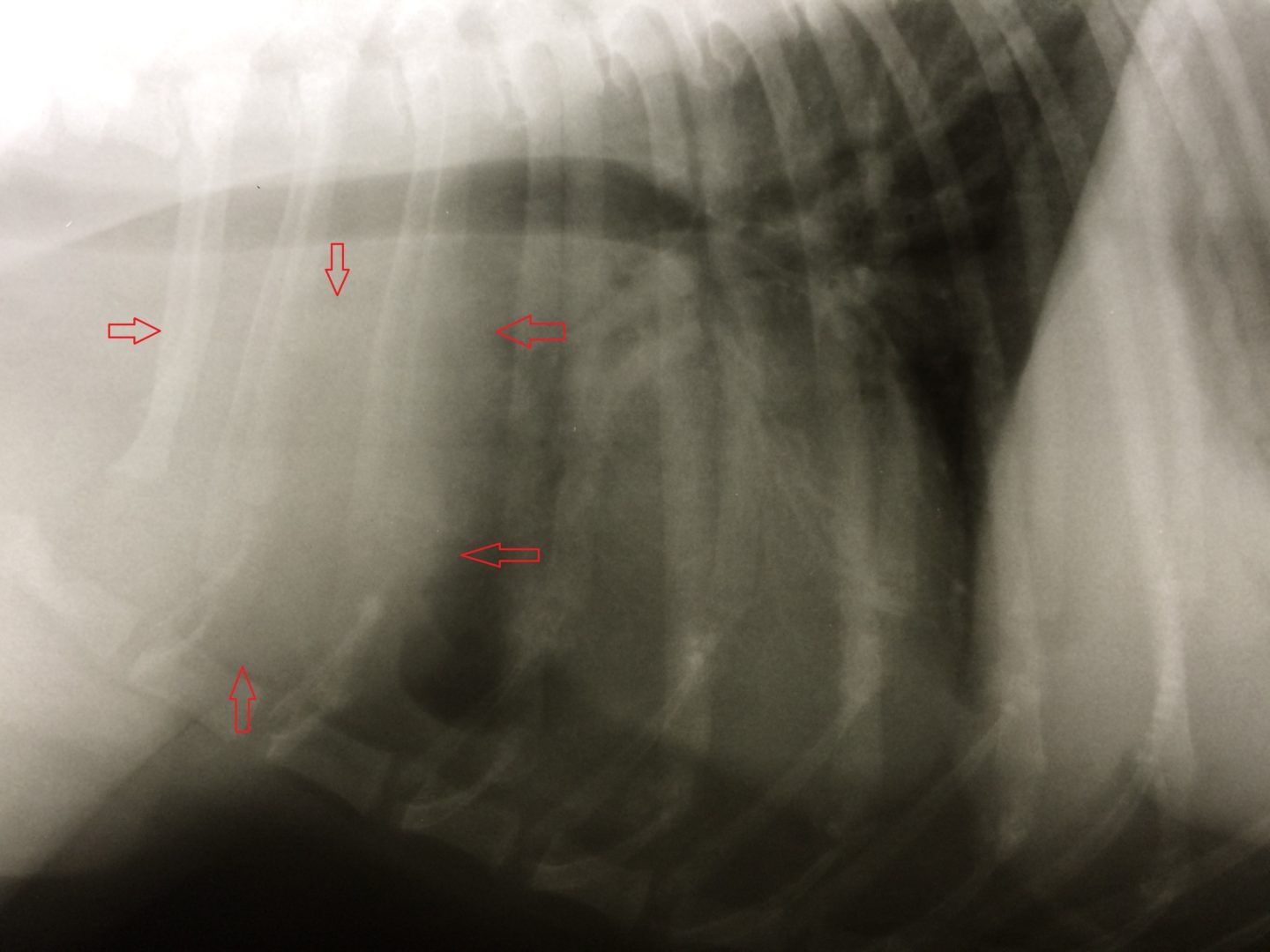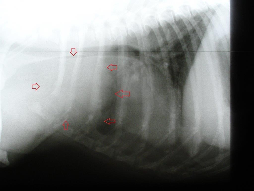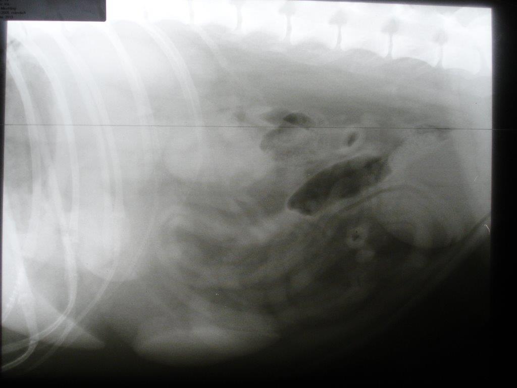 Die Analdrüsen und die äußerlich tastbaren Lymphknoten waren unauffällig. Daraufhin wurden Röntgenaufnahmen von Brust- und Bauchraum angefertigt. Im Brustkorb befand sich vor dem Herzen eine tennisballgroße Zubildung. Zur Diagnosestellung wurde dieser Tumor unter Ultraschallkontrolle mit einer Spritze punktiert und Zellmaterial gewonnen. Dieses Feinnadelaspirat wurde zu einem spezialisierten Tierpathologen geschickt. Der Befund: „Malignes Lymphom“. Das maligne Lymphom kann in einen B- und T-Zell-Typ eingeteilt werden, je nachdem welche Lymphozytenfraktion betroffen ist. In diesem Fall war es das schwieriger zu therapierende T-Zell-Lymphom. Die Ultraschalluntersuchung des Bauchraumes zeigte keine Veränderungen im Bereich von Leber, Milz und den anderen Lymphknoten des Bauches.
