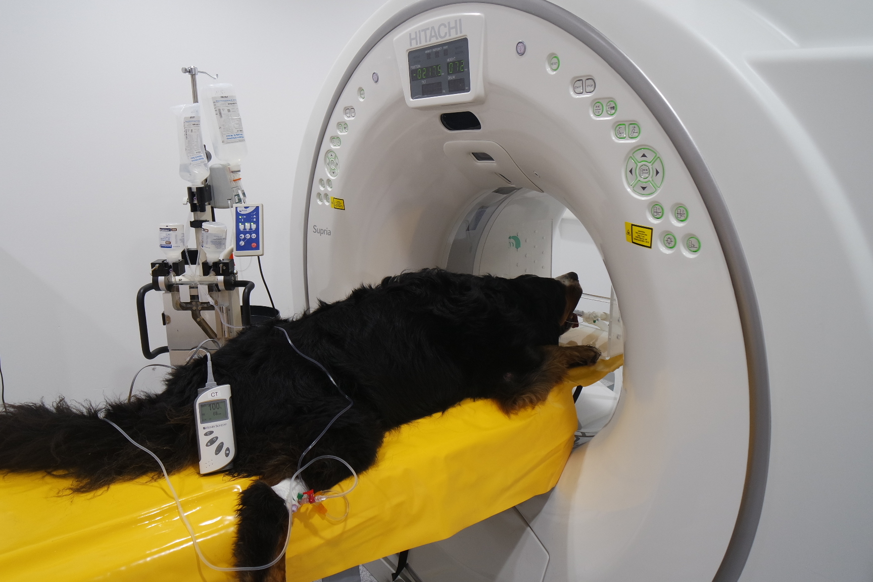 Leo wurde nun nach einer gründlichen allgemeinmedizinischen sowie labortechnischen Untersuchung zur Computertomographie (CT) angemeldet, die in Vollnarkose stattfinden muss. Mit dieser Technik werden mit Hilfe von Röntgenstrahlen ein Millimeter dünne Schichtaufnahmen angefertigt und damit das genaue Ausmaß des Tumors dargestellt. Zum anderen kann im Vergleich zu einem konventionellen Röntgenbild eine überlagerungsfreie Aussage über den Zustand des benachbarten Weichteilgewebes getroffen werden. Diese Informationen sind für den Chirurgen unumgänglich, damit er die Operation planen kann.