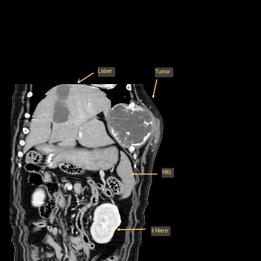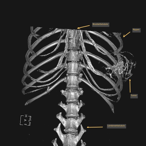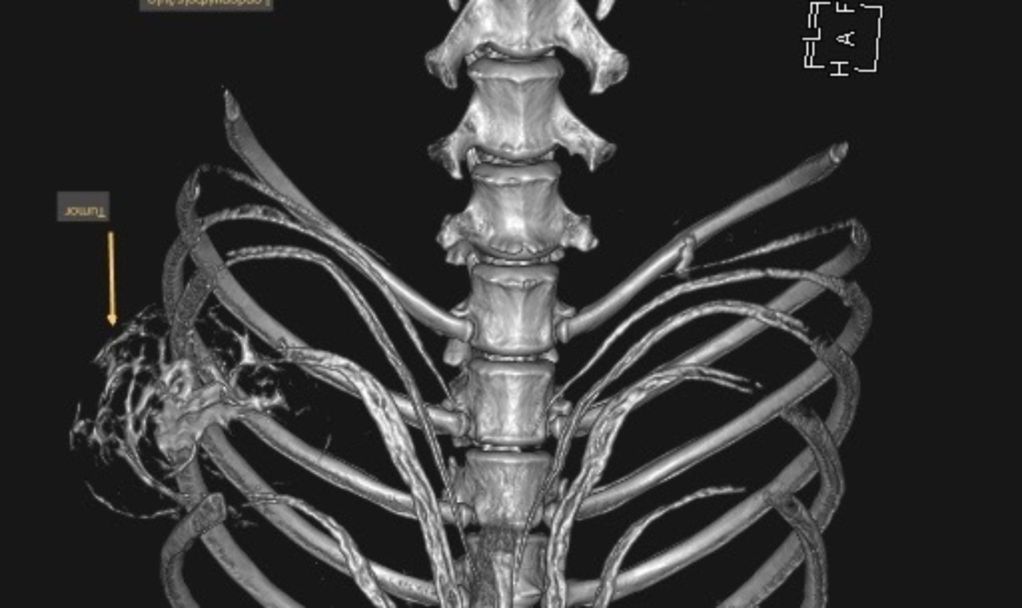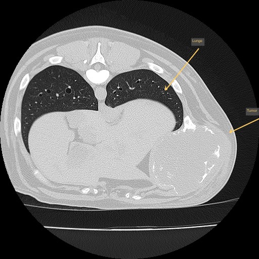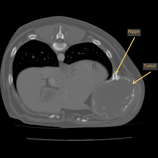 In diesem Fall wurde durch die CT das enorme Ausmaß der Umfangsvermehrung deutlich, sodass insgesamt drei Rippen inklusive der dazwischenliegenden Muskeln in Mitleidenschaft gezogen wurden. Die gute Nachricht war, dass der innerhalb der Bauchhöhle unmittelbar anliegende linke Leberlappen, Magen und Milz sowie der hintere Anteil des linken Lungenflügels im Brustkorb noch nicht vom Tumorwachstum erfasst waren.