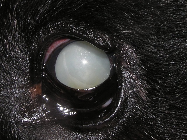 Das Wort Katarakt kommt aus dem Griechischen und bedeutet wörtlich „herabstürzen“, womit „Wasserfall“ gemeint ist. Die weiße Farbe aufgewirbelten Wassers ähnelt der Trübung einer kataraktösen Linse, und so entstand der medizinische Begriff. Der deutsche Begriff „grauer Star“ kommt von „starren“ oder „stieren“ getrübter, blinder Augen. Wie wir Menschen können auch unsere Haustiere aus verschiedenen Gründen einen grauen Star ausbilden. Ausmaß und das Fortschreiten der Trübungen sind unterschiedlich. Im Allgemeinen sind sie nicht rückgängig zu machen. Es gibt angeborene, erbliche sowie altersbedingte Formen der Katarakt, aber auch Verletzungen am Auge können langfristig zu Linsentrübungen führen. Beim Diabetes des Hundes kann es stoffwechselbedingt zu einer Linsentrübung kommen. Sofern der Diabetes nicht erkannt wird oder schlecht eingestellt ist, kann die Trübung schnell voranschreiten und innerhalb von Tagen bis wenigen Wochen zu einer Erblindung führt. Diese diabetische Katarakt geht mit einer Linsenschwellung einher, die sogar dazu führen kann, dass die Kapsel der Linse reißt, was zu einer starken Entzündung im Auge und bei Nichtbehandlung zum Verlust des Sehvermögens führt. Bei älteren Hunden fällt häufig eine homogen-bläuliche, symmetrische Trübung der Linsen auf. Hierbei handelt es sich um eine altersbedingte Verdichtung des Linsenkerns (senile Nukleosklerose) und sie gilt es in der Augenuntersuchung von der Katarakt abzugrenzen. Diese Alterstrübung entsteht beim Hund teilweise schon ab dem sechsten Lebensjahr - bei Katzen meist erst später - und schreitet langsam voran. Sie führt allerdings nur äußerst selten zu Seheinschränkungen und ist daher nicht operationswürdig (Foto 2).