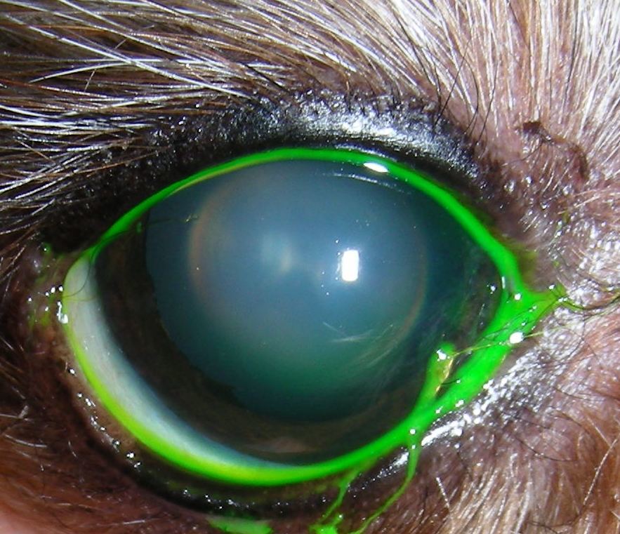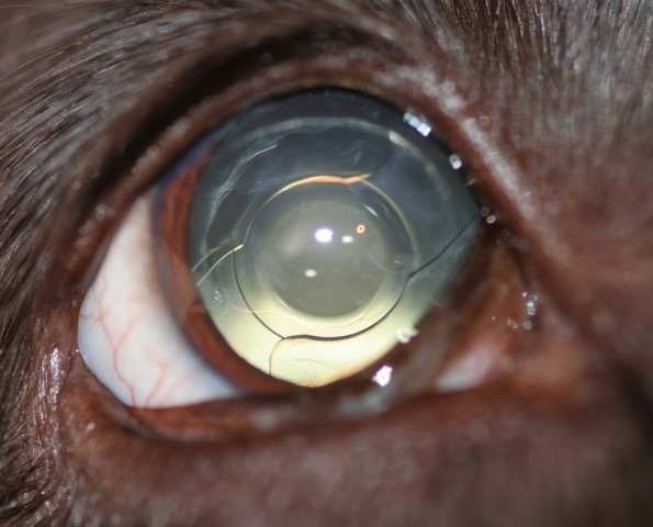 Die Hündin „Lena“ ist in letzter Zeit unsicher geworden und scheint seit zwei Wochen gar nichts mehr zu sehen, da sie vor allem in ungewohnter Umgebung mit der Schnauze anstößt. Außerdem ist vor einigen Monaten bei der 8-jährigen Mischlingsdame die Zuckerkrankheit (Diabetes) diagnostiziert worden. Trotz Behandlung waren ihre Blutzuckerwerte in der ersten Zeit noch zu hoch. Sie wird zur Augenuntersuchung in unsere Tierärztliche Praxis für Augenheilkunde überwiesen. Bei der Untersuchung fällt auf, dass „Lena“ bei Bewegungen vor ihrem Auge kein Blinzeln zeigt. Beide Linsen sind so stark getrübt, dass der hintere Augenbereich mit Glaskörper und Netzhaut nicht mehr einsehbar ist (mature Katarakt, s. Foto 1).