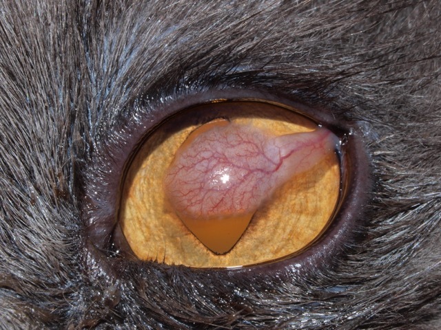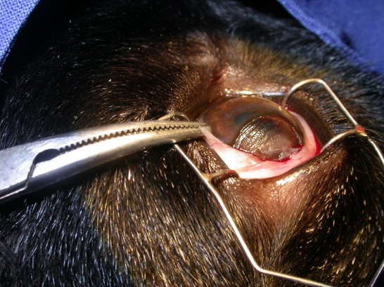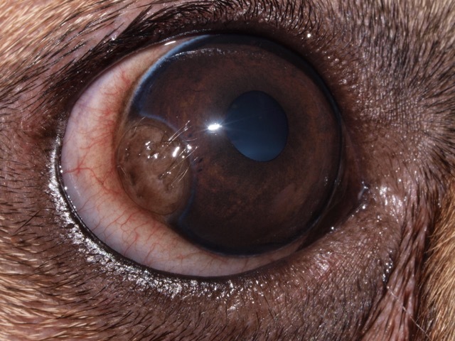 Die Trübung/Pigmentierung auf dem rechten Auge stellte sich schnell als ein sogenanntes Dermoid heraus. Auch die Einschätzung des Besitzers, dass dort Haare wachsen, war richtig. Ansonsten zeigten Louis Augen keinerlei weitere Auffälligkeiten. Ein Dermoid stellt eine angeborene, „versprengte“ Hautanlage dar, d.h. es wächst Haut mit teils Haaren, Schweißdrüsen, evt. Knorpel, Bindegewebe und Blutgefäßen an Stellen, an denen keine Haut vorgesehen ist. Am Auge zeigt sich dies typischerweise an der eigentlich transparenten Hornhaut und der Bindehaut. Manchmal sind auch die Lider davon betroffen. Ein Dermoid ist immer angeboren und entwickelt sich bereits im Mutterleib durch eine gestörte Embryonalentwicklung. Da Hunde ihre Augen erst 14 Tage nach der Geburt öffnen, fällt es zunächst nicht sofort auf. Haare müssen nicht von Beginn zu sehen sein und können erst mit der Zeit wachsen. Abgesehen davon, dass – je nach Größe des Dermoids - mit einer gewissen Sehfeldeinschränkung gerechnet werden muss, irritieren die Haare die Hornhaut, führen zu Rötungen, eitriger Sekretion, chronischen Hornhautentzündungen und Vernarbungen. Deshalb ist in aller Regel eine Operation erforderlich.