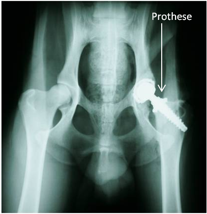 Der künstliche Hüftgelenkersatz wird in der Tiermedizin seit mehr als 30 Jahren zur Behandlung von Hüftgelenkerkrankungen und -Traumata verwendet. Im Grunde werden bei diesem Verfahren Oberschenkelkopf und Pfanne durch eine sog. Oberschenkelkopf- und Pfannenprothese ersetzt. Es gibt verschiedene Modelle von Prothesen. Tylers Oberschenkelkopfprothese besteht aus Titan, die Pfanne besitzt eine Außenhülle ebenfalls aus Titan und eine Innenbeschichtung aus Polyäthylen (s. Abb. 3).