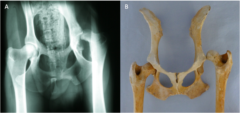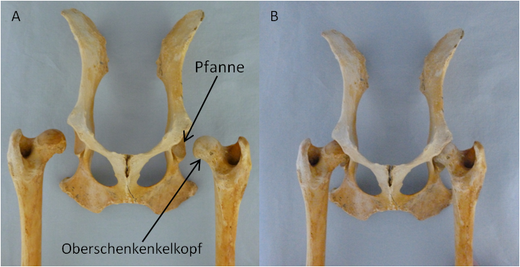 "Tyler", ein Dobermann-Mix, wurde am 18. August 2011 vom Nümbrechter Tierschutzverein "Menschen für Tiere e.V." in der Praxis vorgestellt mit dem Hinweis, er habe große Probleme mit seiner Hüfte und könne nur sehr schlecht laufen. Er war abgemagert bis auf die Knochen, lethargisch und litt sichtbar unter Schmerzen. Tyler zeigte einen deutlichen Muskelabbau und einen Hochstand des rechten Oberschenkels. Bei der Ganguntersuchung ist uns eine starke Lahmheit dieses Beines aufgefallen. Der Bewegungsumfang des Hüftgelenkes war deutlich eingeschränkt und bei der Streckung zeigte der Hund Schmerzen. Daraufhin haben wir eine Röntgenuntersuchung durchgeführt, wobei sich herausstellte, dass die Hüfte luxiert war, mit anderen Worten: der Oberschenkelkopf saß nicht in der richtigen Position. In einer funktionierenden Hüfte sitzt der Oberschenkelkopf in der Pfanne (s. Abb. 1). Bei Tyler saß der Oberschenkelkopf oberhalb der Pfanne. Er wies diese Veränderung seit langer Zeit auf, so dass der Oberschenkelkopf eine Pseudopfanne im Becken gebildet hatte (s. Abb. 2).