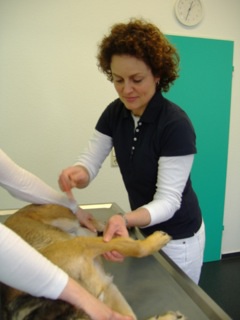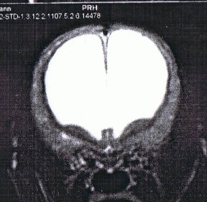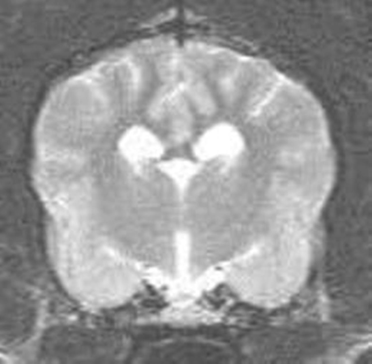 Skip wurde ausführlich körperlich untersucht, besonderes Augenmerk wurde auf die neurologische Untersuchung, vor allem seine Reflexe gelegt (Bild 1 und 2). Diese Untersuchungen verliefen absolut unauffällig. Es bestand kein Verdacht auf eine Funktionsstörung irgendeines Organs, die die Anfälle hätte erklären können. Die Befunde der allgemeinen und neurologischen Untersuchungen wurde durch eine umfangreiche Blut-und Urinuntersuchung ergänzt. Besonders wichtig ist die Überprüfung der Leberfunktion durch die Messung des Blutammoniaks, da eine Leberfunktionsstörung einerseits Ursache epileptischer Anfälle sein kann, andererseits die Medikamente zur Bekämpfung von Krampfanfällen häufig über die Leber verstoffwechselt werden müssen. Bei Skip waren alle Werte absolut normal. Eine weitere Abklärung möglicher Ursachen einer Epilepsie ist jetzt nur noch in Narkose möglich und beinhaltet die Kernspintomographie (MRT) und eine Hirnwasseruntersuchung. Nun besagt eine Studie aus Hannover, dass Hunde wie Skip, die beim ersten Anfall jünger als 6 Jahre waren und bei denen alle Voruntersuchungen bisher unauffällig verliefen, in 10% der Fälle eine krankhafte Veränderung des Gehirns aufweisen. Bei älteren Hunden liegt dieser Anteil mit 25% deutlich höher. Die Besitzer von Skip wollten auch die letzten 10% der Zweifel an einer idiopathischen Epilepsie ausschließen. Daher ließen sie die noch fehlenden Untersuchungen durchführen. Das MRT konnte keine strukturellen Veränderungen im Kopf nachweisen und das Hirnwasser enthielt keine Hinweise auf eine Entzündung des Gehirns. (Bild 3)