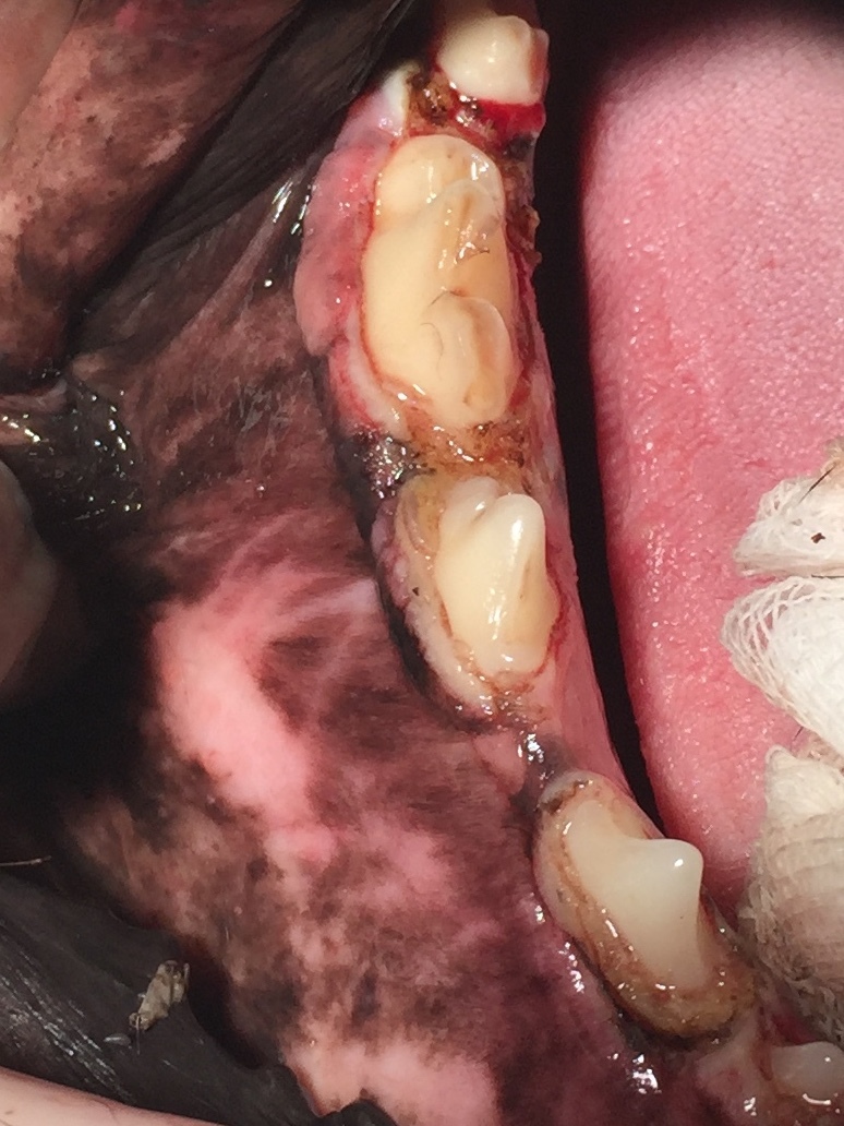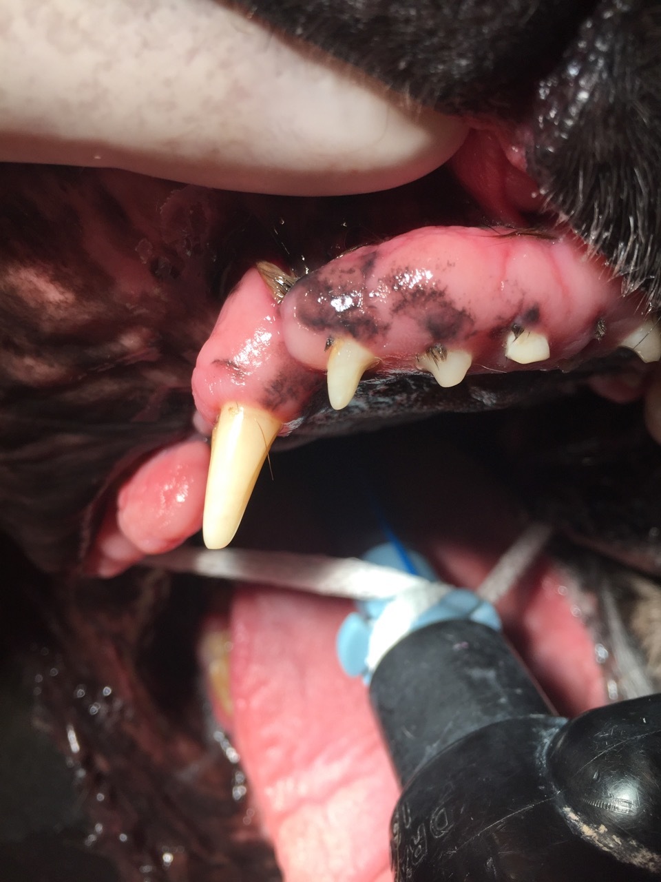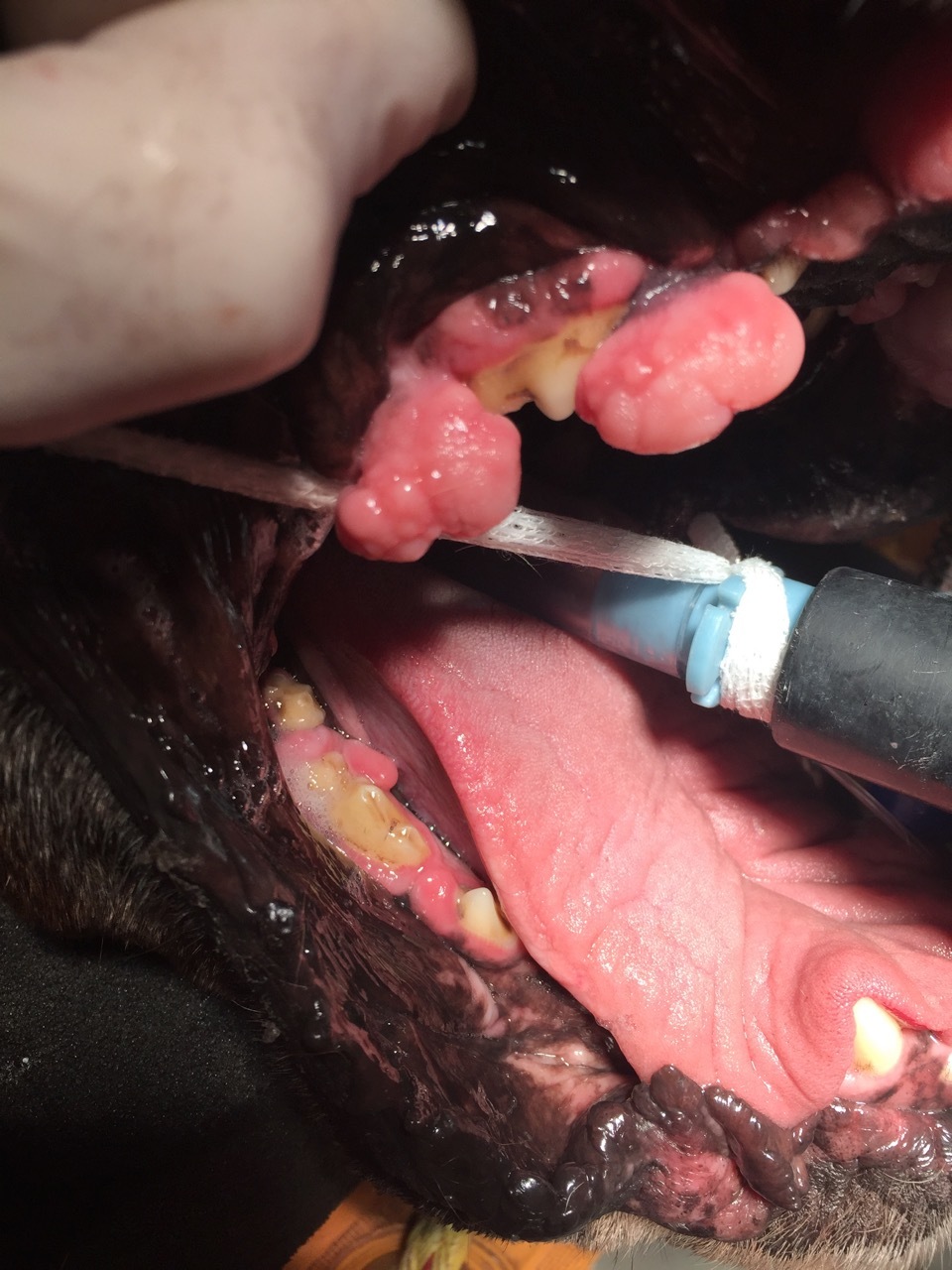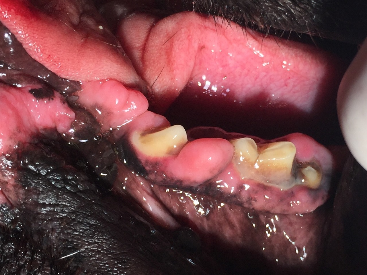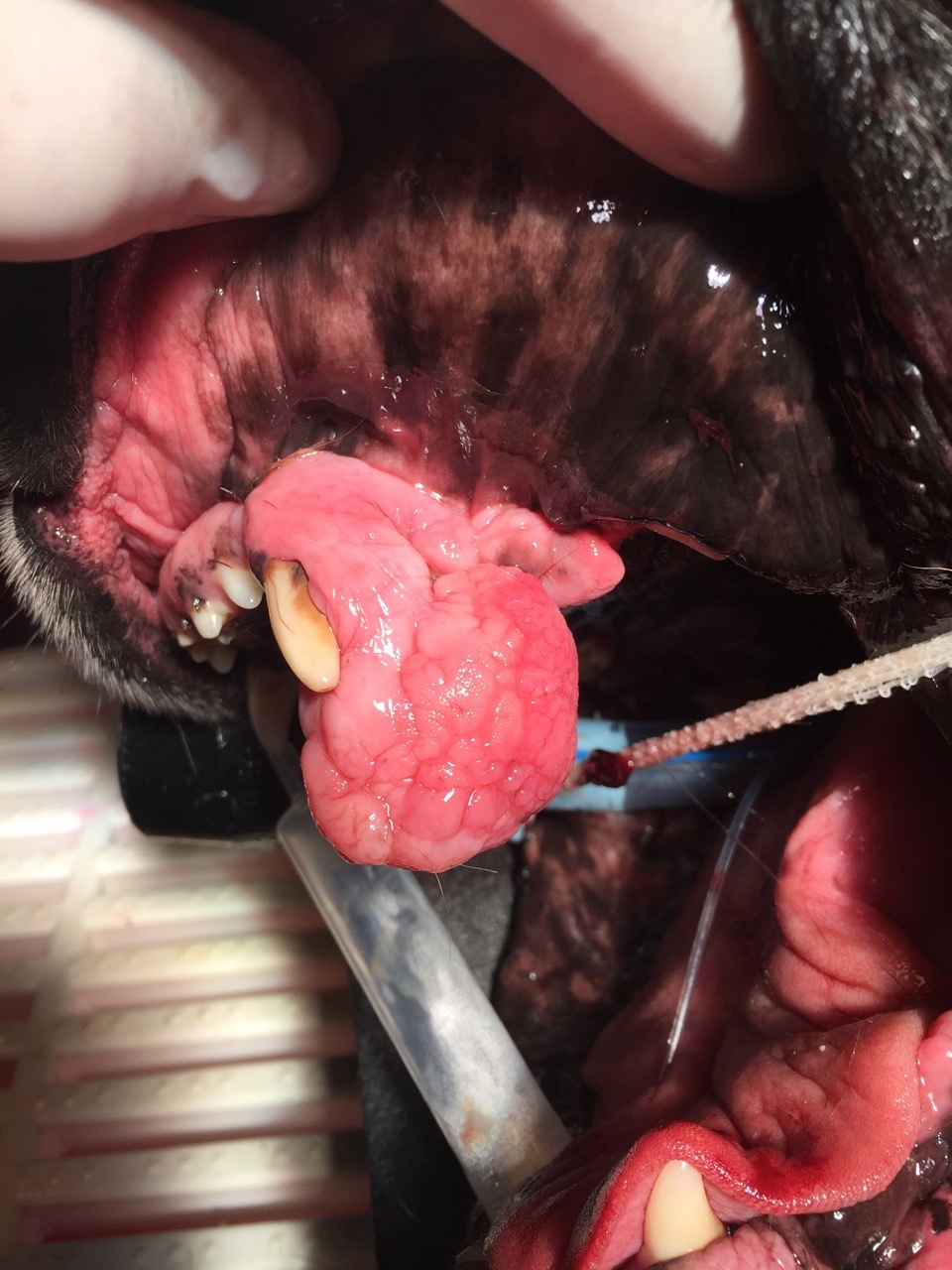 Inspektor, ein 11 Jahre alter Boxerrüde, wurde von seinem Haustierarzt in unsere Praxis überwiesen mit dem Vorbericht, dass starker Mundgeruch und Mundhöhlentumoren aufgefallen seien, die bei der Futteraufnahme einbluteten. Die Zähne seien teilweise vom Zahnfleisch überwuchert.