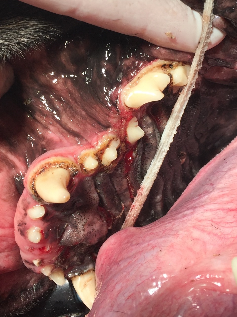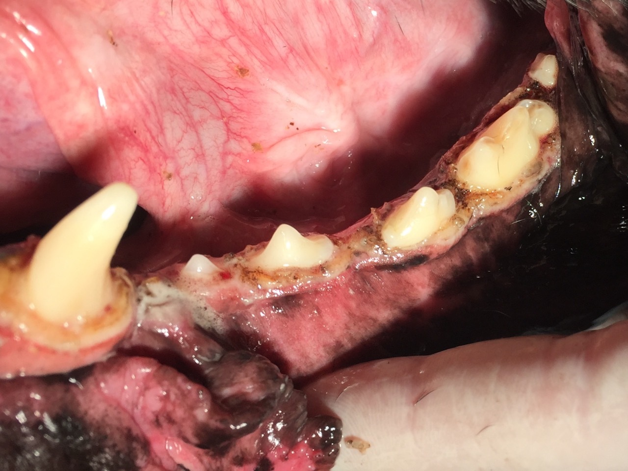 Von der Einteilung bezeichnet man die Epuliden als gutartige Zubildungen, die dem Zahnfleisch aufsitzen. Sie bilden keine Metastasen (Tochtergeschwülste) aus. Allerdings können sie erhebliche Ausmaße annehmen, wie man anhand der Abb.3 sehen kann. Die Epuliden können somit sowohl zu einer mechanischen Einschränkung beim Zermahlen des Futters als auch zu entzündlichen Veränderungen führen, dadurch erhebliche Schmerzen verursachen und sogar Zähne verdrängen. Zusätzlich konnte man in allen vier Quadranten bei Inspektor eine Gingivahyperplasie verzeichnen, die sich durch überwuchernde Zahnfleischbereiche darstellt. Teilweise werden ganze Zähne überwachsen vom Zahnfleisch, so dass hier massive Taschen entstehen, die Futterreste, Haare und anderes Fremdmaterial aufnehmen (Abb 1). Die daraus folgenden Entzündungen, die sich bis auf den tieferen Zahnhalteapparat auswirken, bedingen einen Rückgang des Knochens. Die Parodontitis ist in vollem Gange und lässt sich nur noch stoppen, aber nicht mehr heilen. Betroffene Zähne werden ab einem Furkationsbefall Grad 3 (die Wurzelaufteilung liegt gut sondierbar frei) extrahiert.