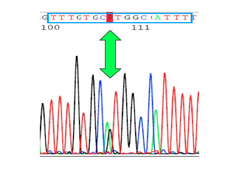 Nach Vervielfältigung des zu untersuchenden Genabschnitts mittels PCR wird bei einer nachfolgenden Sequenzierung die Nukleotid-/Basenabfolge der DNA direkt abgelesen. Dazu wird die Didesoxymethode nach Sanger (auch Kettenabbruch-Synthese genannt) angewendet, bei der in einer zweiten PCR mit fluoreszenzfarbstoffmarkierten Reagenzien gearbeitet wird, deren Einbau bei der Replikation jeweils zum Abbruch der Kettenreaktion führt. Die entstehenden Kettenabbruchprodukte werden mittels Kapillargelelektrophorese aufgetrennt und mit Hilfe eines Lasers zur Fluoreszenz angeregt. Das enthaltende Fluoreszenzmuster, gemessen über eine Detektor, spielgelt die Sequenz/Abfolge der Basen des untersuchten DNA-Strang wieder (Abb. 2 und 3).