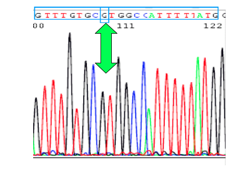 Häufig liegen Punktmutationen vor, bei denen nur eine einzige Base in der DNA ausgetauscht ist. Es gibt allerdings auch Deleletions-, Insertions- und Duplikationsmutationen, bei denen eine oder mehrere Basen deletiert (fehlen), inseriert (zusätzlich eingebaut) oder dupliziert (doppelt eingebaut) sind.