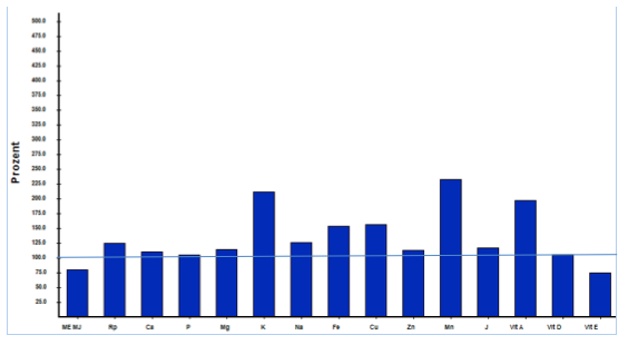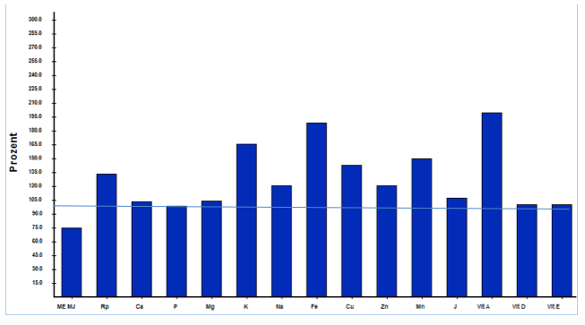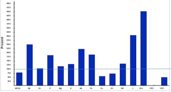 Die kleine Hündin bekam gekochtes Bio-Rind- und Hühnerfleisch, dazu Gemüse, Petersilie und mittags Buchweizen oder Couscous. Am Abend gab es roh abwechselnd Pansen, Blättermagen oder Hühnerhälse, dazu als Belohnung etwas Graubrot, Käse und Obst, ab und an etwas Hagebuttenpulver und Seealgenmehl. Wie in Abbildung 1 ersichtlich, enthält die Ration zu viel Eiweiß und Phosphor und ist damit nicht geeignet, die Nieren zu entlasten. Darüber hinaus gibt es eine Unterversorgung mit Kupfer, Zink und Vitamin D. Anders als Menschen können Hunde kein Vitamin D unter Sonnenlicht bilden – es muss ihnen vielmehr zugefüttert werden. Jod und Vitamin A sind zu reichlich enthalten. Bei den Zutaten fehlen, wie so oft in hausgemachten Rationen, Öle, um den Bedarf an essenziellen Fettsäuren zu decken.