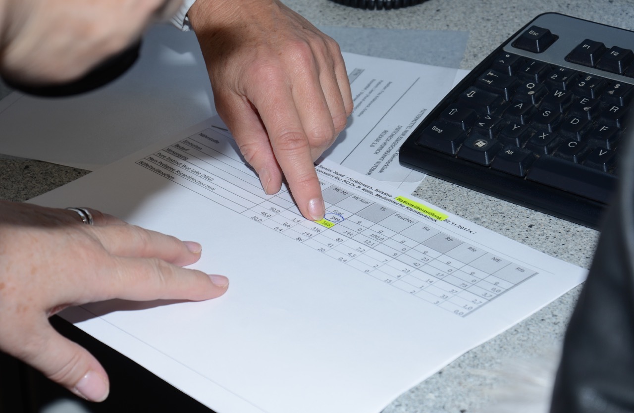 Zu Beginn des Termins wird Hund Bonzo auf einer großen Waage gewogen. Anschließend wird sein Hals-, Brust- und Bauchumfang mit einem Maßband vermessen und sein Ernährungszustand anhand des Body Condition Score bestimmt. Das Body Condition Scoring ist ein Punktesystem zur neutralen Beurteilung des Ernährungszustandes eines Tieres. Danach wird zusammen mit dem Besitzer ein Ernährungsplan mit Hilfe des Computerprogramms „Diet Check“ erstellt. Hier werden die einzelnen Komponenten der gewünschten Futterration eingegeben und überprüft, ob diese alle wichtigen Nährstoffe enthält und der Kaloriengehalt entsprechend der gewünschten Diät angepasst. Dabei kann ganz individuell auf die Wünsche des Hundes als auch der Besitzer eingegangen werden. Die Rationen können aus Fertigfutter, rohen, selbst gekochten Komponenten oder einer Kombination daraus zusammengestellt werden. Auch Leckerlis werden berücksichtigt. Die erstellte Ration wird zusammen mit einem Futterplan ausgedruckt und dem Besitzer mitgegeben. Außerdem werden begleitende Maßnahmen, wie z.B. Anreiz zu mehr Bewegung oder die Verwendung eines Anti-Schling-Napfes besprochen.