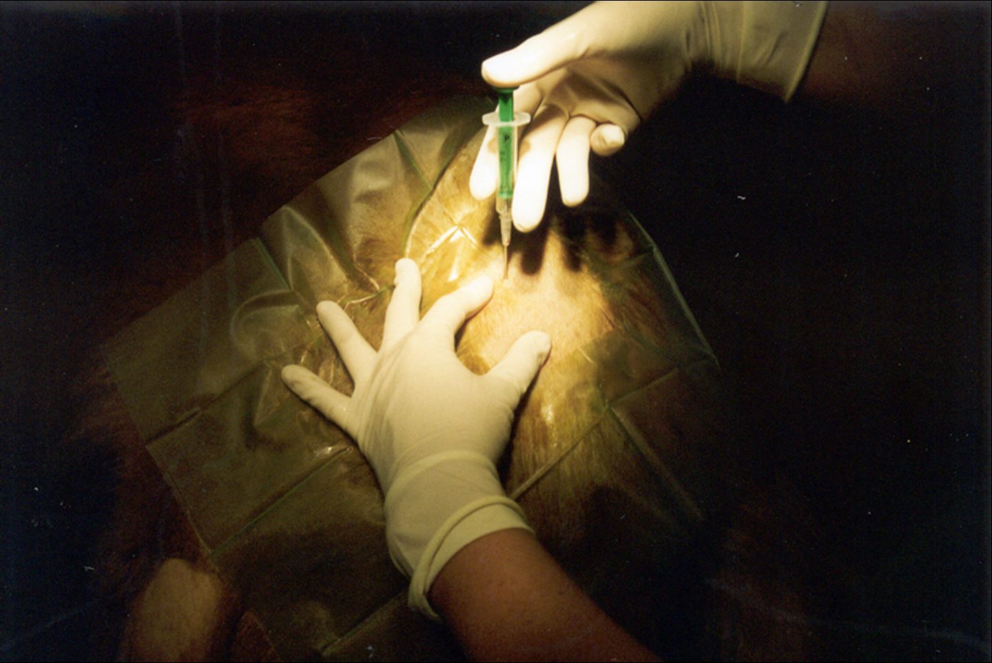 In der Gangbildanalyse wurde die Lahmheit hinten links und vorne rechts bestätigt. Cash lief sehr schwerfällig und zeigte eine deutliche Hüftrotation auf der rechten Seite. Die Ellenbogen waren beide stark ausgestellt und Cash schleift über die Vorderfüße. Ein Schwingen im Rücken lässt Cash nicht zu und hält sich in der Rückenmuskulatur sehr fest. Die Untersuchung der Triggerpunkte war für Cash besonders im Rücken, an den Hüften, den Knien und den Ellenbogen sehr unangenehm. Nach der Blutuntersuchung, die keine Abweichungen ergab, und der folgenden in einer leichten Sedation ausgeführten ausführlichen Röntgendiagnostik wurden alle Befunde (beidseits hochgradige HD, hochgradige Ellenbogenarthrose rechts und links, Knie links post OP) und die mögliche Prognose für Cashs Schmerzbehandlung besprochen. Die Besitzer entschieden sich für eine Goldakupunkturbehandlung ihres Hundes.