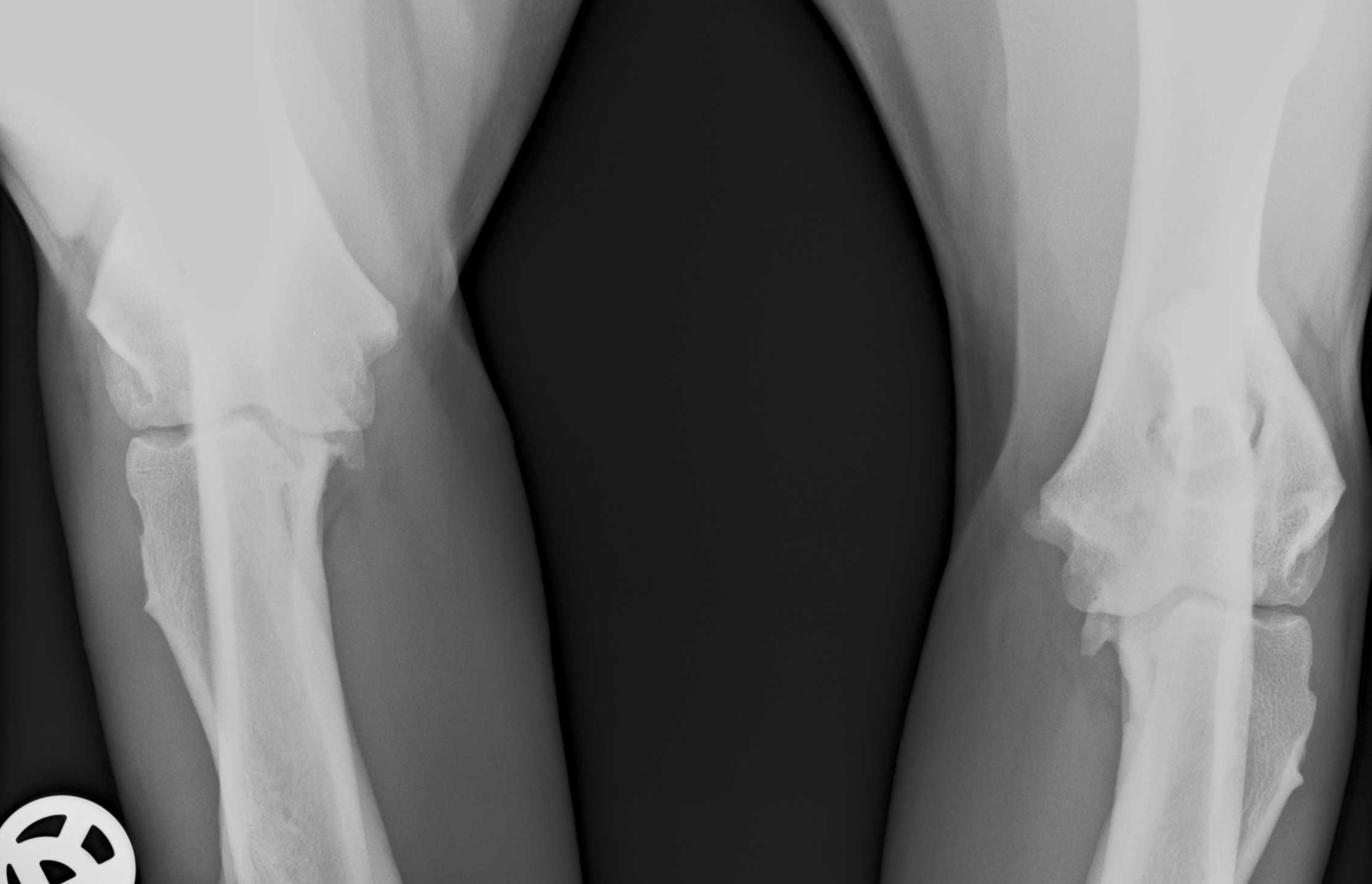 Der damals 3 Jahre alte Bullmastiff-Rüde Cash wurde uns 2016 in der Praxis vorgestellt. 2015 wurde er am linken Knie aufgrund eines Kreuzbandrisses operiert. Die Besitzer berichteten, dass Cash immer wieder Probleme mit dem operierten Bein hatte. Er konnte schlecht aufstehen und war wenig bewegungsfreudig. Ab und zu lahmte Cash auch vorne. Die allgemeine Untersuchung ergaben keine besonderen Befunde.