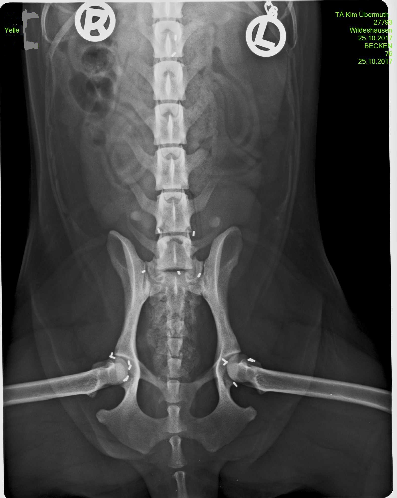 Vor einem Monat wurde uns „Yelle“, eine 4-jährige Cocker-Spaniel-Hündin, vorgestellt. Durch die Gangbildanalyse, der Untersuchung der Triggerpunkte und das folgende Röntgen wurde schnell klar, dass Yelle durch eine sehr lose schmerzhafte Hüfte ein deutlich verändertes Gangbild zeigte. Die Besitzer entschieden sich daher frühzeitig für eine Goldakupunktur, um Folgeschäden an den anderen Gelenken zu minimieren. Die Kontrolluntersuchung nach der Goldimplantation verlief sehr positiv - Yelle will spielen und toben. An diesem Punkt ist es wichtig, dem Muskelaufbau Zeit zu geben und den Hund noch nicht zu viel toben zu lassen. Eine geregelte Bewegung und eventuelle physiotherapeutische Unterstützung hilft, das Gangbild zu stabilisieren.